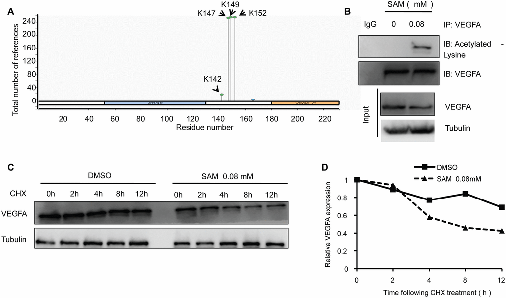To identify the effect of L-dopa and SAM on the VEGFA level, we examined the change in VEGFA expression in HUVECs using western blot and real-time PCR. The data showed that the protein levels of VEGFA are concentration-dependently downregulated in both primary cultured and immortalized HUVECs following SAM treatment, compared with the DMSO group (Figure 1A and Supplementary Figure 1A). Conversely, L-dopa treatment upregulated the VEGFA expression at the protein level (Figure 1B and Supplementary Figure 1B). Additionally, we used the non-toxic concentration of L-DOPA (15 μM) and non-toxic concentration of SAM (0.08 mM) lower than previous reported [20, 21]. Combinational treatment of L-dopa and SAM showed that SAM could weaken the L-dopa-induced VEGFA expression in primary cultured HUVECs (Figure 1C). However, neither SAM nor L-dopa could induce a significant change in VEGFA expression at the transcriptional level in HUVECs (Figure 1D, 1E and Supplementary Figure 1C, 1D). These results are different from the findings of Ohlin’s study, which demonstrated that VEGFA mRNA is upregulated following L-dopa stimulation in primary cerebral astrocytes [12]. The reason of this difference may occurred by the diversity of cell background and culture conditions. Given that posttranslational modifications (PTMs), such as acetylation [22], are important for modulating the VEGFA protein, we explored whether VEGFA is regulated in a similar manner by SAM treatment. As expected, four probable acetylation sites could be identified in full-length sequence of VEGFA protein by PhosphoSitePlus website (https://www.phosphosite.org/) (Figure 2A). Moreover, SAM significantly promoted the acetylation of VEGFA in both primary cultured and immortalized HUVECs cells (Figure 2B and Supplementary Figure 2). In addition, we performed CHX assays to further determine the protein stability of VEGFA. We found that SAM treatment could expectedly attenuate the half-life of the VEGFA protein in primary cultured HUVECs cells (Figure 2C, 2D). Collectively, these data suggest that SAM and L-dopa stimuli have opposing effects on the VEGFA protein stability in HUVECs.