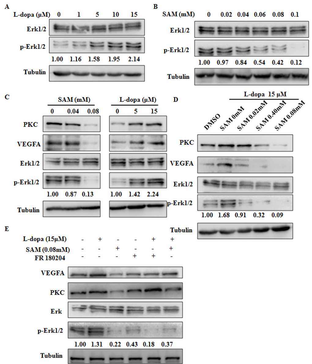 Nowadays, increasing reports have demonstrated that the expression and activity of VEGFA could be regulated at the post-translational level. The polyADP ribosylation and glycosylation are the two major post-translational modifications of VEGFA, which influence its secretion and biological function [47]. In addition, histone H3 mediated VEGFA acetylation promoted VEGFA upregulation in injured peripheral nerves, thus participating in angiogenesis and reinforcing pain behaviors [48]. The previous studies showed that phosphorylation modification of VEGFA plays important roles in VEGFA regulated angiogenesis in HUVECs [49]. Our present study demonstrated L-dopa elevated levels of ERK phosphorylation whereas the inverse change was seen with SAM treatment. As SAM can promote the acetylation of VEGFA, further research is needed to clarify the effect of SAM on the phosphorylation of VEGFA.