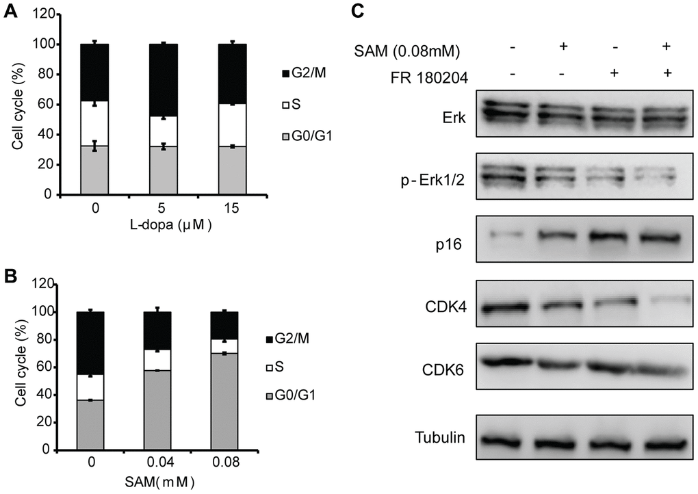 Since cell proliferation could be effectively regulated by cell cycle progression [31], we next examined the effect of L-dopa and SAM on cell cycle distribution. Different concentrations of L-dopa and SAM were administered to primary HUVECs after overnight serum starvation, and cell cycle distribution was assessed using the flow cytometry method. Compared with the DMSO treated group, L-dopa treatment could lead to an increase in the number of proliferative cells (Figure 3C, 3D), but no obvious changes in cell cycle exists (Figure 6A). The reasons for the pro-proliferation effect of L-dopa might be due to other factors, such as the prolonged mitosis [32], and not the cell cycle arrest. However, SAM significantly increased the percentage of cells in the G0/G1 phase (57.69 ± 0.30 for 0.04 mM SAM, 70.11 ± 1.40 for 0.08 mM SAM) compared to DMSO-treated cells (36.25 ± 1.90). This increase was coupled with a significant decrease in the percentage of cells in the G2/M phase (26.93 ± 1.30 for 0.04 mM SAM, 19.54 ± 1.22 for 0.08 mM SAM) (Figure 6B). It is well known that cyclin-dependent kinases (CDKs) function as the key factor that drives cell cycle progression [33]. To further confirm the G1/S phase arrest phenotype due to SAM intake, we investigated the cell cycle-associated checkpoint CDK4/6, the regulators required for G1/S transition [34]. As shown in Figure 6C, it was found that SAM markedly decreased the CDK4/6 expression level while increasing the level of p16, a specific CDK inhibitor [35]. Moreover, the combination of SAM and FR180204 could further suppress the G1 phase regulators CDK4/6, which further indicates the important roles of ERK signaling in the effect of SAM in HUVECs. Taken together, these findings demonstrate that SAM has a preferential pro-cell cycle arrest effect on the primary HUVECs.
