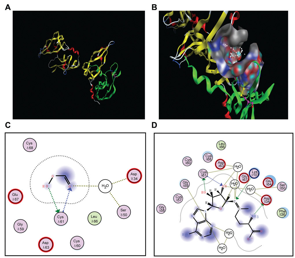 To investigate the possible binding sites of SAM in the VEGFA protein, a molecular docking analysis was conducted using MOE v2014.090 software (Chemical Computing Group). The crystal structure of VEGFA (PBD ID: 1MKK) was downloaded from the RCSB Protein Data Bank [56] (http://www.rcsb.org/pdb/explore/explore.do?structureId=1mkk). In addition, the 2D or 3D structures of SAM were both obtained from the PubChem website [57] (https://pubchem.ncbi.nlm.nih.gov/). Regularization and optimization for VEGFA and SAM were performed with internal default parameters. In the analysis process, the active site of VEGFA was considered a rigid molecule, whereas the phytochemicals were treated as being flexible. The docked performic acid (PFA) was assigned a score according to its fit in the ligand binding pocket of VEGFA, serving as the control binding mode.