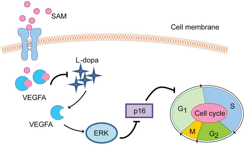 The purpose of this investigation was to identify the modulation mechanism of SAM on L-dopa-induced VEGF expression. In the current study, using the cultured HUVEC model and cell biology techniques, we present potential insight into the functions of SAM on L-dopa-induced VEGFA expression and tube formation. In the first step, we discovered the opposite effects of L-dopa and SAM on the VEGFA protein level and cell proliferation rate. Then, molecular mechanism studies revealed that SAM administration, blocking the pro-angiogenic ability of L-dopa, is dependent on the ERK activation to some extent (Figure 8).