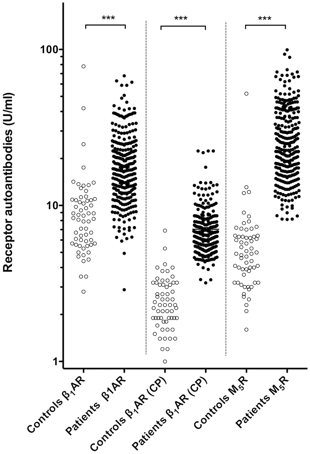Pre-analytical handling of blood samples and determination of established parameters of generalized inflammation (CRP and IL-6), myocardial ischemia (TpI), and cardiac wall tension (proBNP) in sera followed routine diagnostic procedures accredited according to DIN EN ISO 15689. β1AR-Aabs, and autoantibodies against the muscarinic acetylcholine receptor M5 (M5R-Aabs), were measured with commercially available ELISAs (CellTrend GmbH, Luckenwalde, Germany) according to the instructions of the manufacturer. Both these assays provide native receptors presented in their physiological membrane environment as immunogenic targets for IgG binding. In addition, β1AR-Aabs were determined by IgG-binding to a cyclic peptide providing a valid representation of the conformational epitope within the second extracellular loop of the receptor associated with the active receptor conformation. It has been demonstrated that pre-absorption with this peptide neutralises the cardio-pathogenic potency of stimulatory receptor antibodies in mice [23]. The cyclic peptide was coated onto microtiter plates by established procedures and these plates were processed in a similar manner as the above commercial assays. The two assays for β1AR-Aabs exhibited a reasonable correlation (Suppl. Figure 1) with just a few extreme outliers, which, most probably, are due to the presence of β1AR-Aabs not directed against the second extracellular loop of the receptor.