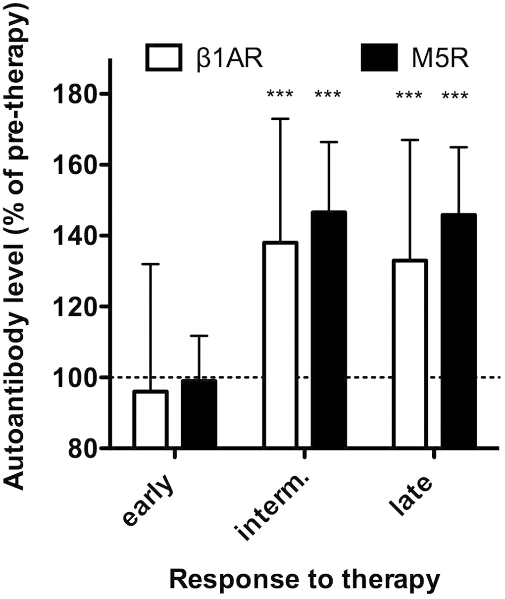 In the next step, we examined the impact of periodontal therapy on β1AR and M5R autoimmunization. For this purpose, we compared within the periodontitis group baseline levels of β1AR- and M5R-Aabs (pre-therapy and on the day of therapy) with corresponding values measured at each of the post-therapy follow-up visits. Autoantibody levels did not significantly change from pre-therapy to follow-up determinations at 8 and 17 weeks after therapy. However, at 30 weeks and more after therapy, β1AR- and M5R-Aabs were significantly (p < 0.001) increased by about 40% above pre-therapy levels, and these increases remained stable until 112 weeks after therapy (Figure 2). It should be noted that data from all patients, who left the study at any time during post-therapy follow-up for undisclosed reasons (N = 80) were excluded from the above longitudinal analyses.