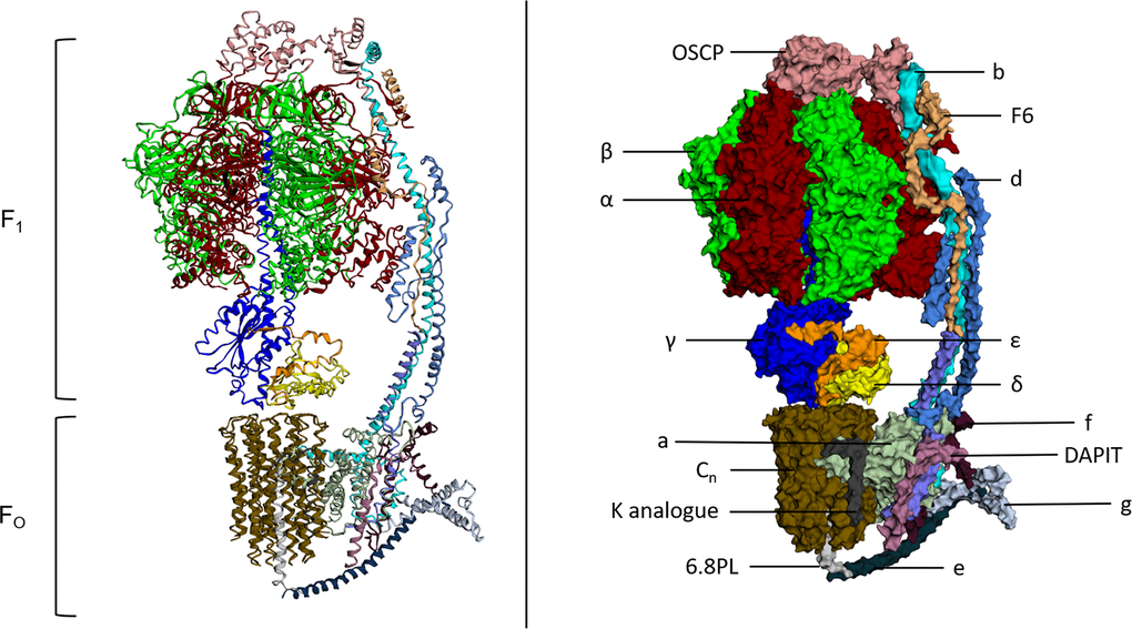 After ATP synthase’s function was described in vitro, landmark measurements including the kinetic parameters of its three-site cooperative-binding catalytic mechanism and the discovery that protein conformational changes would facilitate the release of tightly bound ATP were reported [22, 23]. The atomic structure of the complex was resolved to 2.8 Å in 1994, revealing a structure which supported the mechanism of rotary catalysis [24]. Since 1994, multiple atomic structures of both eukaryotic and prokaryotic ATP synthase structures have been published, with a recent cryo-EM structure of ATP synthase from S. scrofa shown in Figure 1 [25–28]. ATP synthase consists of two distinct components; a membrane bound FO component and a matrix exposed F1 component. They function cooperatively through a central rotor stalk and a peripheral stator stalk.