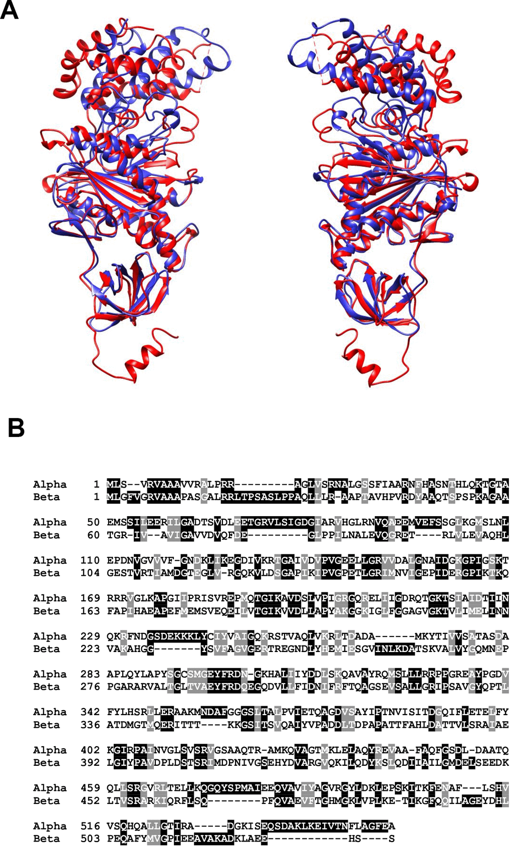 The F1 component is solvent exposed and far more about its activity and structure is understood than its FO counterpart. Its subunit composition is α3β3γδε, with its structure being a six part barrel of alternating α and β subunits, a central asymmetric γ subunit (the aforementioned rotor stalk) protruding through the centre of the barrel while the δ and ε subunits are found at the matrix exposed surface of the FO c-ring [24]. The site of catalysis is located at the interface of the α and β subunits, both of which have nucleotide binding sites and multiple studies of atomic structures have shown nucleotides bound at this interface [40–42]. Interestingly, both α and β subunits possess the same folds despite only sharing around 20% sequence homology [16]. The structural similarities are presented in Figure 2 using the atomic structures of ATP synthase in S. scrofa [27, 43]. Despite the similarity, only the β-subunit possesses catalytic activity due to its ability to form an open conformation as well as possessing a catalytic base for the reverse ATP hydrolysis reaction [44, 45].