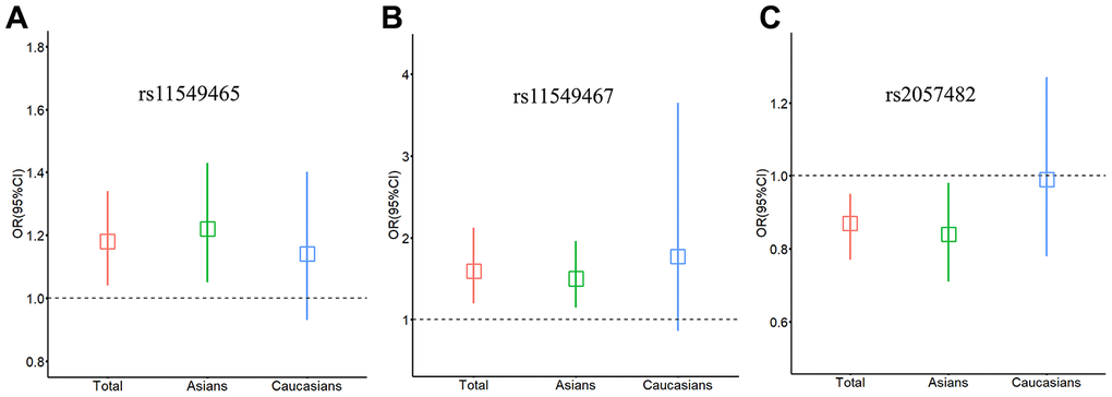 We evaluated the effect of the 3 SNPs on cancer risk among the subgroups. In the stratified analyses of ethnicity (Figure 1A–1C), the variant T allele of rs11549465 had a significant association with increased risk of cancer among Asian populations (dominant model: OR = 1.22, 95% CI = 1.05-1.43) (Table 1). At the same time, the association between the rs11549467 and the increased risk of cancer was also significant among Asians (dominant model: OR = 1.50, 95% CI = 1.15-1.96) (Table 2). The association between rs2057482 and decreased cancer risk was also significant among Asian populations (dominant model: OR = 0.84, 95% CI = 0.71-0.98) (Table 3). However, none of the 3 SNPs was significantly associated with cancer risk among Caucasians.
