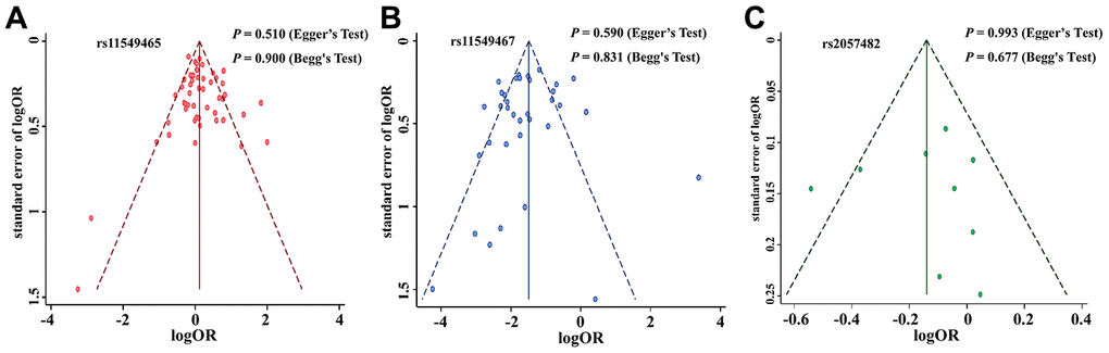 We excluded studies that were not in Hardy Weinberg Equilibrium (HWE) to evaluate the stability of the previously acquired results. The results of the 3 SNPs were still statistically significant after omitting the studies that were not in HWE, which confirmed that the obtained results of the meta-analysis were stable and robust. We then utilised the funnel plot, Begg’s test, and Egger’s test to evaluate potential publication bias of the studied literature. The funnel plots were symmetrical in case of all the studied SNPs (Figure 2A–2C). Moreover, Begg’s test and Egger’s test provided further statistical evidence for the absence of publication bias in all the studied SNPs (dominant model: P > 0.05).