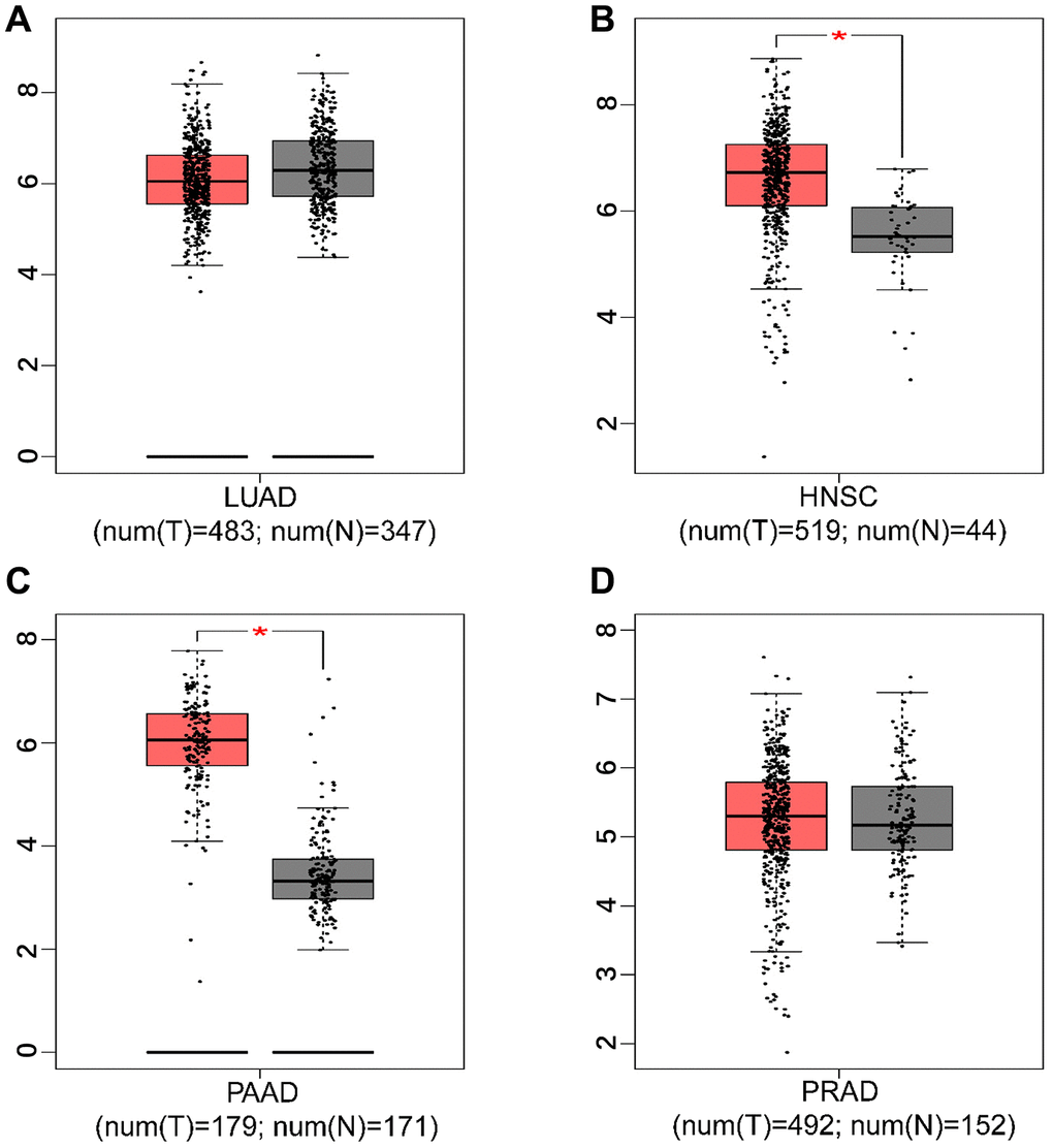 Stratified analysis indicated that HIF-1α SNPs (rs11549465, rs11549467, or rs2057482) were mainly associated with the risk of pancreatic, lung, head and neck, and prostate cancers. We then quantified the expression levels of HIF-1α in the above four cancers using the GEPIA database. The expression levels of HIF-1α was significantly higher in head and neck squamous cell carcinoma (HNSC) and pancreatic adenocarcinoma (PAAD) tissues (P < 0.05), as shown in Figure 3. However, we did not observe any significant association for HIF-1α expression in lung adenocarcinoma (LUAD) and prostate adenocarcinoma (PRAD) tissues.