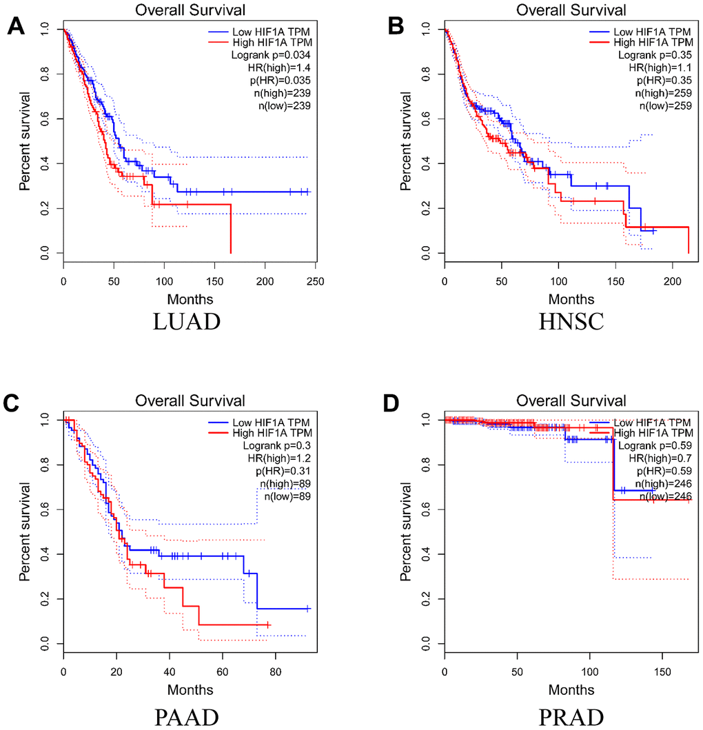 To evaluate the function of HIF-1α in the survival rate of the above mentioned four cancer types, we conducted Kaplan-Meier analysis according to HIF-1α expression and cancer survival based on GEPIA database. As shown in Figure 4, high expression of HIF-1α was associated with poor survival in subjects with LUAD (P = 0.034). However, HIF-1α expression was not associated with the survival of subjects in the other three cancer types.