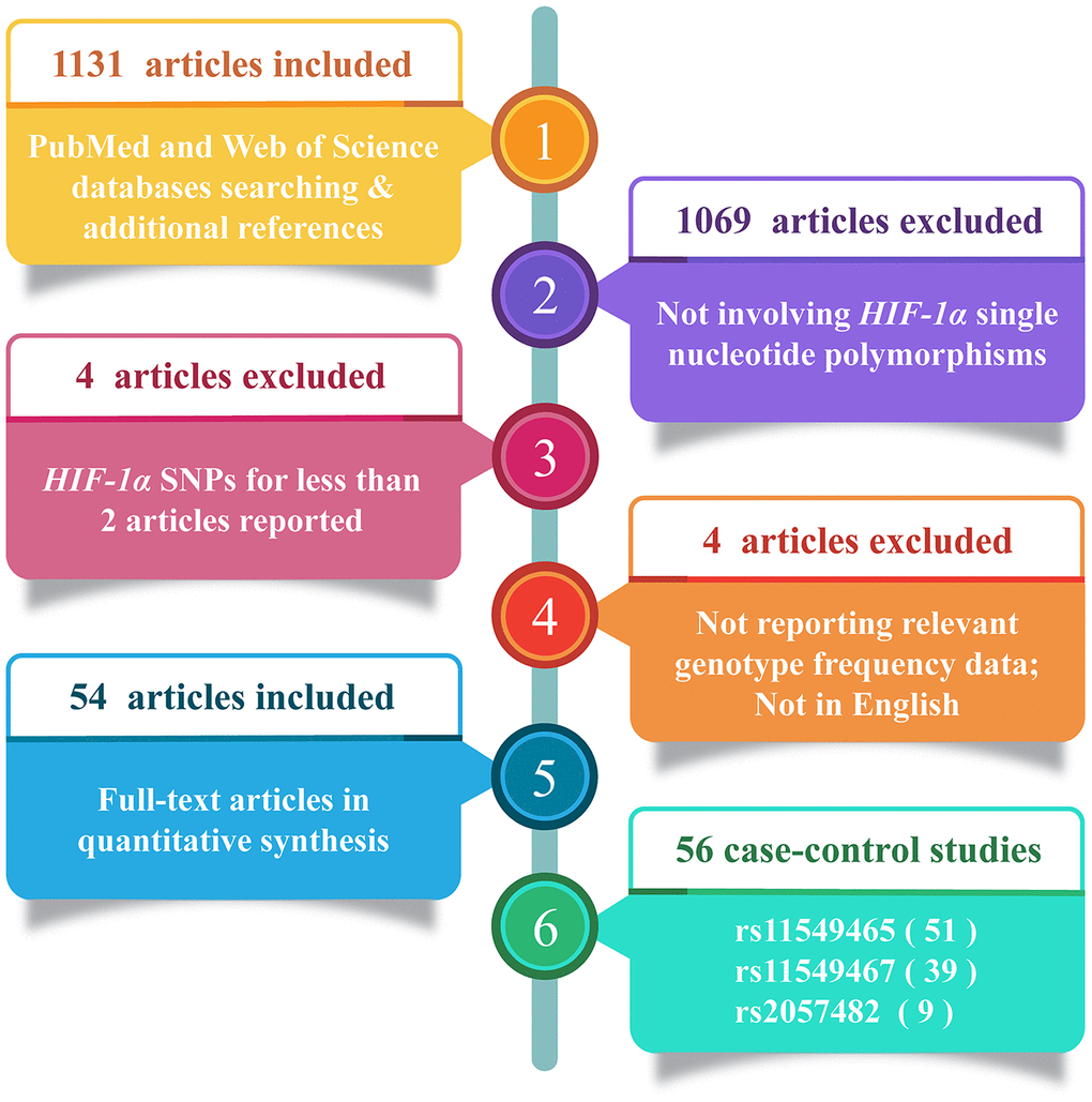 A comprehensive literature search of research papers published before April 30, 2020, using PubMed and Web of Science databases was performed. We used the following keywords: (“polymorphism”, “variation”, “variant”, or “ mutation”) and (“cancer”, “carcinoma”, “ tumor”, “ tumour”, or “neoplasm”) and (“hif1a”, “HIF-1A”, “hif1-a”, “hif1alpha”, “HIF-1Alpha”, “hif1-alpha”, “hypoxia inducible factor 1 alpha”, “ hypoxia inducible factor-1alpha”, “hypoxia inducible factor1-alpha”, “hypoxia-inducible factor 1 alpha”, “hypoxia-inducible factor-1alpha” or “hypoxia-inducible factor1-alpha”). The meta-analysis included only full-text articles available in English. In addition, to obtain all eligible publications, the references in the retrieved articles were reviewed. In this meta-analysis, studies meeting the following criteria were included: (1) involving HIF-1α polymorphisms and cancer risk; (2) designed as case-control studies; (3) at least two articles for each studied HIF-1α SNP; (4) containing available genotype frequencies of HIF-1α SNPs (e.g., rs11549465, rs11549467 and rs2057482). The exclusion criteria were as follows: Studies that (1) did not focus on cancer risk; (2) did not study HIF-1α SNPs (rs11549465, rs11549467 and rs2057482); (3) did not report relevant genotype frequency data; (4) were not published in English. Finally, 54 articles including 56 case-control studies were included in the meta-analysis (Figure 5).
