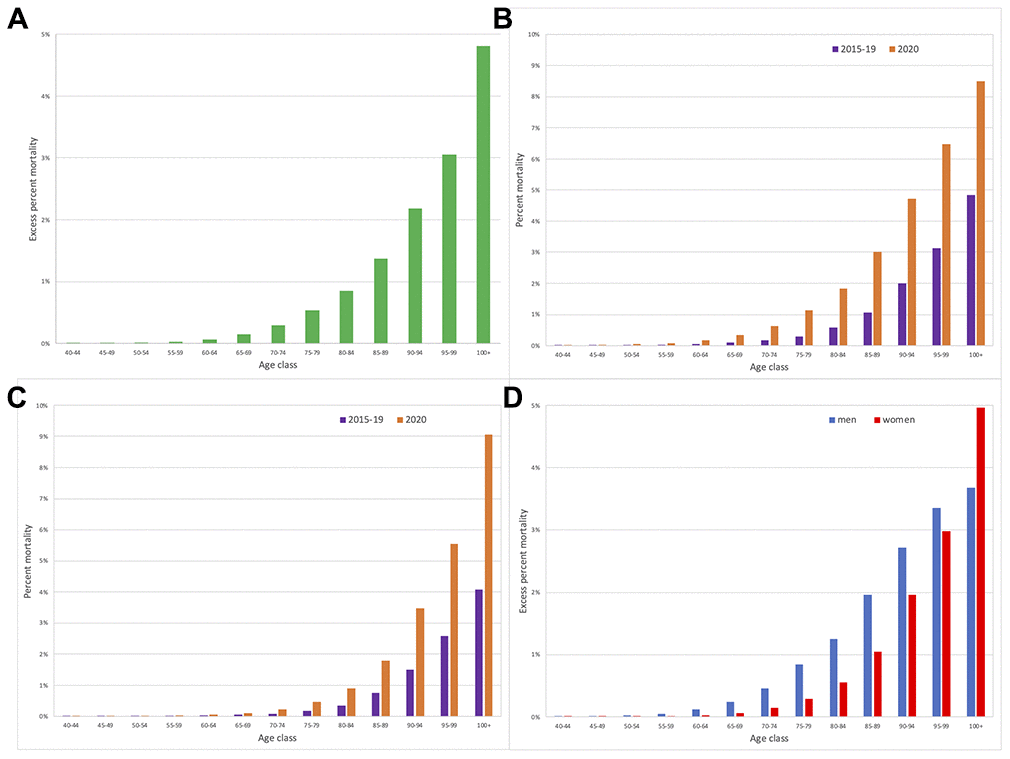 When percent excess death by age class was plotted, a continuous increase in mortality by age was apparent (Figure 1, panel A). This phenomenon was clearly visible in both men (Figure 1, panel B) and in women (Figure 1, panel C), where March 2020 mortality is compared with mean March mortality of the previous years. However, the two patterns had also some differences: in women the increase resulted in approximately a doubling in mortality risk in each age class, whereas in men the greatest relative increase was in "younger" ages, were 2020 mortality was more than three times that of previous years, while in later ages the increase is about 80%. These different changes result in two different patterns of increase by age, i.e. women increase in excess mortality was lower in "younger" ages, but reached that of men in later ages (Figure 1, panel D): while excess mortality under 90 was much higher in men, it was similar in the nonagenarians and in centenarians women even had a higher mortality.