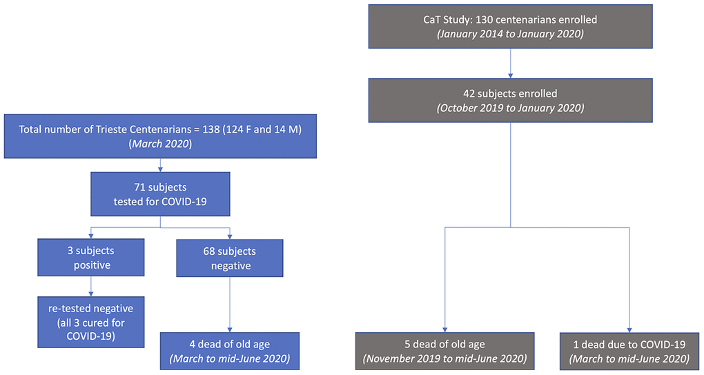 As part of the CaT Study, from October 2019 to January 2020, immediately before medical emergency for COVID-19, we enrolled 42 centenarians using the list of the public health service, 39 women and 3 men (Figure 2). Six centenarians died before April 2020: five women for senectus and without symptoms related to COVID-19 infection. A man was admitted in a ward COVID-19 infected and was the only one dying with COVID-19 pathology. A woman of the 42 centenarians enrolled in the Study tested for COVID-19 was negative despite living in a nursing home with a COVID-19 outbreak, where most of the other elderly guests became positive. She was one of the centenarians belonging to the group of 68 tested negative and mentioned above.