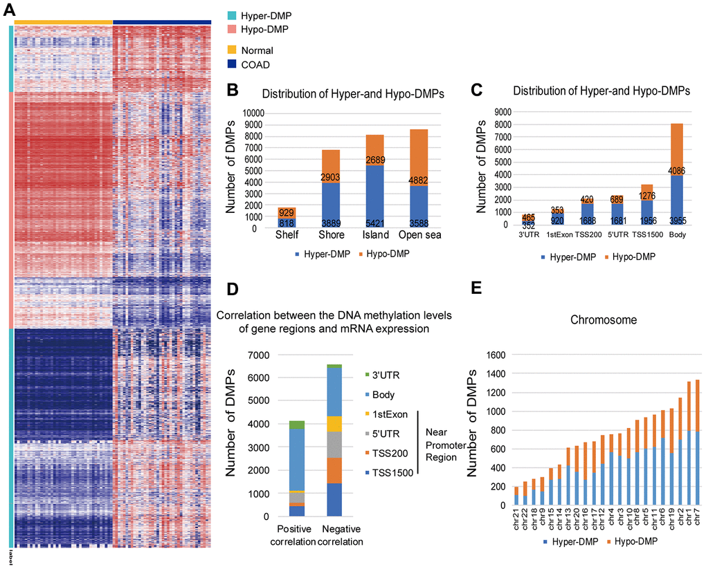 Next, we calculated Pearson correlation coefficients to determine the correlation between the DNA methylation of the DMPs and the expression of their corresponding genes (Figure 2D). Among the 17112 DMPs for which both the DNA methylation levels and the corresponding mRNA expression profiles were available, the methylation levels of 6565 Hyper-DMPs and 4112 Hypo-DMPs were significantly associated with the mRNA levels of the corresponding genes (|r| > 0.1, false discovery rate [FDR] < 0.05). When we analyzed the distance between these DMPs and promoter regions, we found that DMPs in or near promoter regions (i.e., in the 1st Exon, 5′ UTR, TSS200 or TSS1500) were negatively associated with mRNA expression, whereas those outside promoter regions (i.e., in the Body or 3′ UTR) were positively associated with gene expression. Moreover, the DMPs had a higher distribution frequency on chromosomes 7 and 1 than on the other autosomes (Figure 2E). Since the DMPs that significantly altered the expression of their corresponding genes were not limited to promoter regions, we screened the whole genome for potential biomarkers of COAD and constructed a diagnostic prediction model based on the genome-wide Hyper- and Hypo-DMPs.