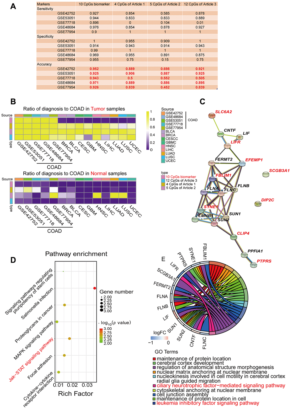 We conducted in-depth KEGG and GO pathway enrichment analyses of the genes corresponding to the nine Hyper-DMPs and one Hypo-DMP, and we analyzed their protein-protein interactions in the STRING database. The leukemia inhibitory factor signaling pathway and the ciliary neurotrophic factor-mediated signaling pathway, both of which can activate the JAK2/STAT3 signaling pathway [34, 35], were found to be enriched in our GO analysis. Coincidentally, the JAK/STAT pathway was found to be enriched in our KEGG pathway analysis. JAK/STAT signaling, especially the overactivation of STAT3 and STAT5, is known to promote tumor cell survival, proliferation, and invasion [36]. Therefore, it is significant that our COAD-specific diagnostic biomarkers were both directly and indirectly associated with the JAK/STAT pathway.