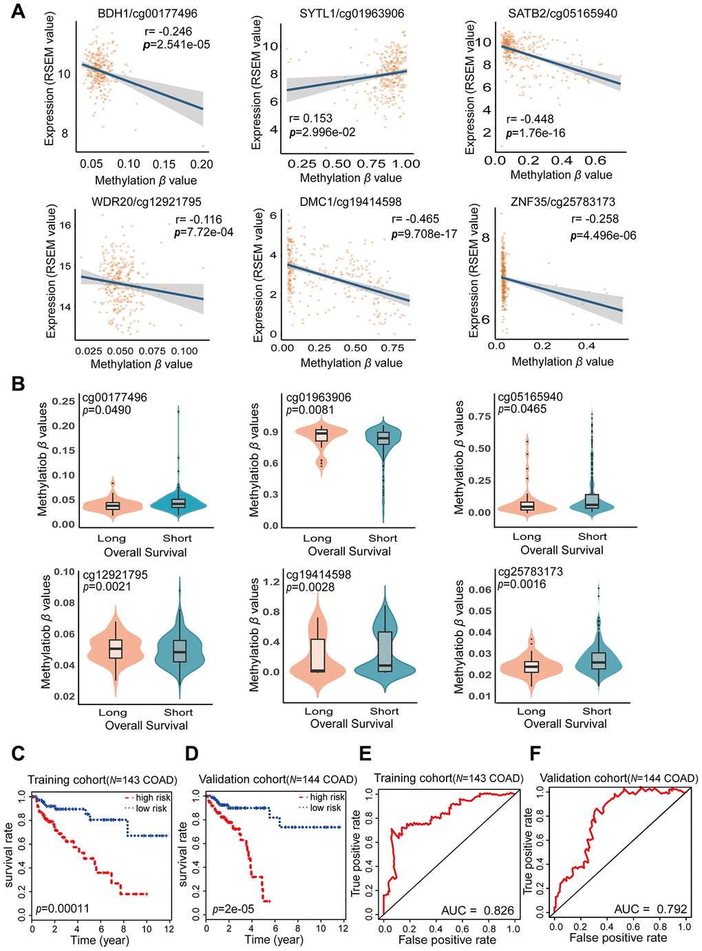 A total of 287 COAD tissue samples in the cohort from TCGA had both methylated β values and corresponding prognostic information. The distribution and corresponding demographic characteristics of these patients are summarized in Table 4. The patients were divided into a training cohort (N = 143) and a validation cohort (N = 144). The training cohort was used to obtain prognostic biomarkers and construct a COAD prognostic model, while the validation cohort was used to test the COAD prognostic model. Univariate Cox hazard regression analysis of the training cohort revealed 64 CpG sites that correlated significantly with the OS of COAD patients (FDR < 0.05); thus, these CpG sites were identified as candidate prognostic biomarkers. Multivariate Cox stepwise regression analysis was applied to these 64 CpG sites, and six sites (cg00177496, cg01963906, cg05165940, cg12921795, cg19414598 and cg25783173) were included in our final hazard ratio model, which was constructed as a combined COAD prognostic model for OS prediction (Table 5). The six CpG sites from our COAD prognostic model were found to correspond to BDH1 (cg00177496), SYTL1 (cg01963906), SATB2 (cg05165940), WDR20 (cg12921795), DMC1 (cg19414598) and ZNF35 (cg25783173) (Figure 5A and Supplementary Table 4). The expression of SYTL1 correlated positively with the methylation level of cg01963906 (r > 0.1, FDR < 0.05), and the expression of the other five genes correlated negatively with the methylation levels of the remaining CpG sites (r < -0.1, FDR < 0.05).