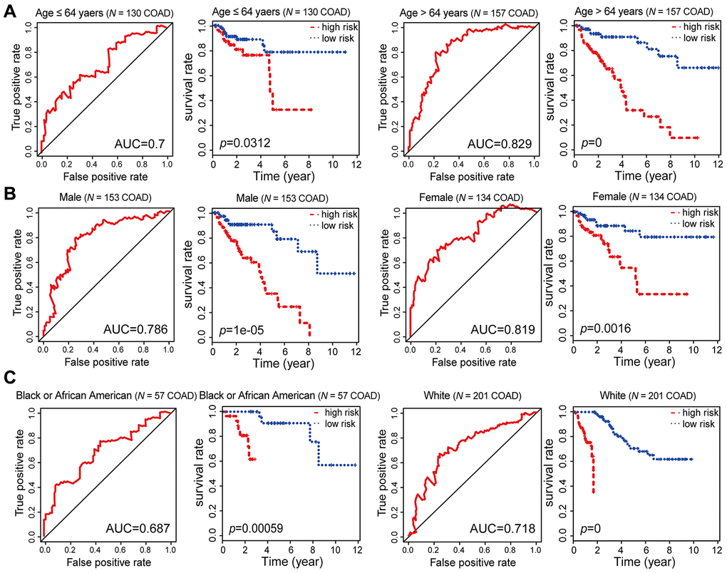 To evaluate the stability and independence of our combined COAD prognostic model based on six CpG sites, we stratified patients according to clinicopathological characteristics such as age, gender, race, AJCC stage, examined lymph node count and lymphatic invasion. Remarkably, the Kaplan-Meier plots displayed significant extension of OS in the low-risk groups for all these characteristics in the 287 COAD samples from TCGA. Nevertheless, the combined COAD prognostic model predicted the survival of COAD patients more precisely than these factors, with an AUC value of 0.687 (Figure 6A–6C, Figure 7A–7C and Supplementary Figure 2). These results confirmed that the combined COAD prognostic model based on six CpG sites provided an excellent reference for different populations and was an independent predictor of patient survival.