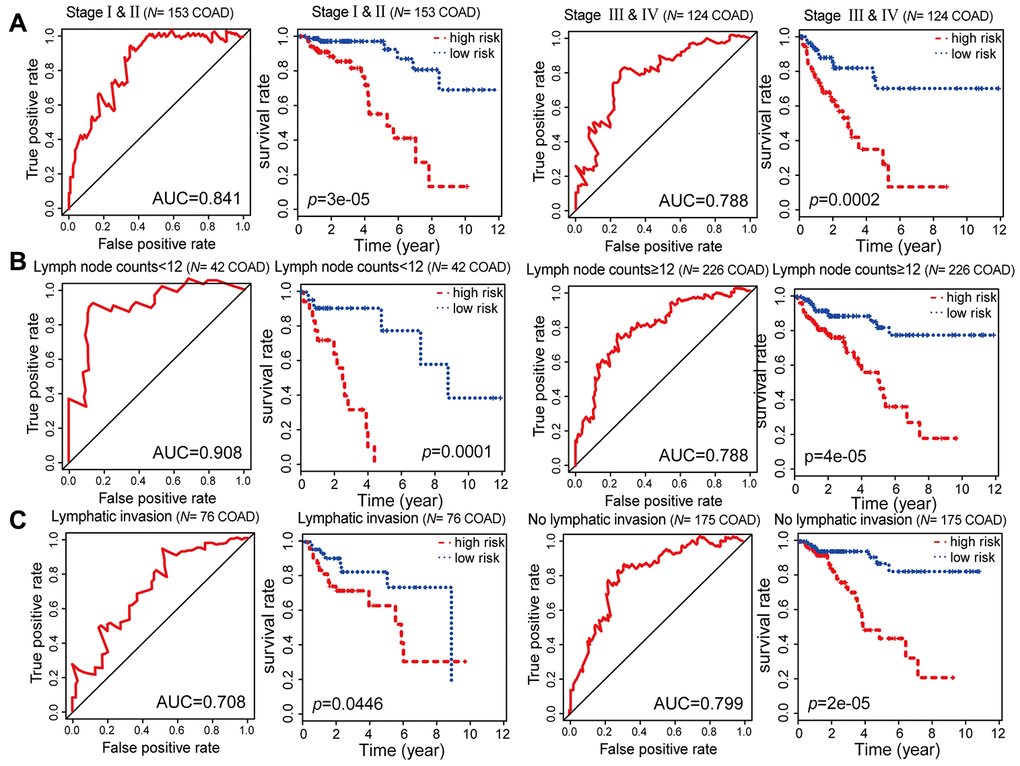 Colon cancer (COAD) is one of the most common malignancies and the third most common cause of tumor-related mortality worldwide [1]. The survival of COAD patients highly depends on the stage of the tumor; thus, the diagnosis of COAD at an early stage can greatly enhance patients’ chances of survival [2]. The five-year survival rate is about 90% for early COAD patients, but is < 10% for advanced COAD patients [3]. Although the American Joint Committee on Cancer (AJCC) tumor, lymph node, metastases (TNM) staging system has contributed to the treatment of COAD patients, it cannot adequately predict prognosis due to the molecular heterogeneity of COAD [4]. Therefore, early diagnostic and prognostic evaluations are important to improve the treatment and overall survival (OS) of COAD patients.
