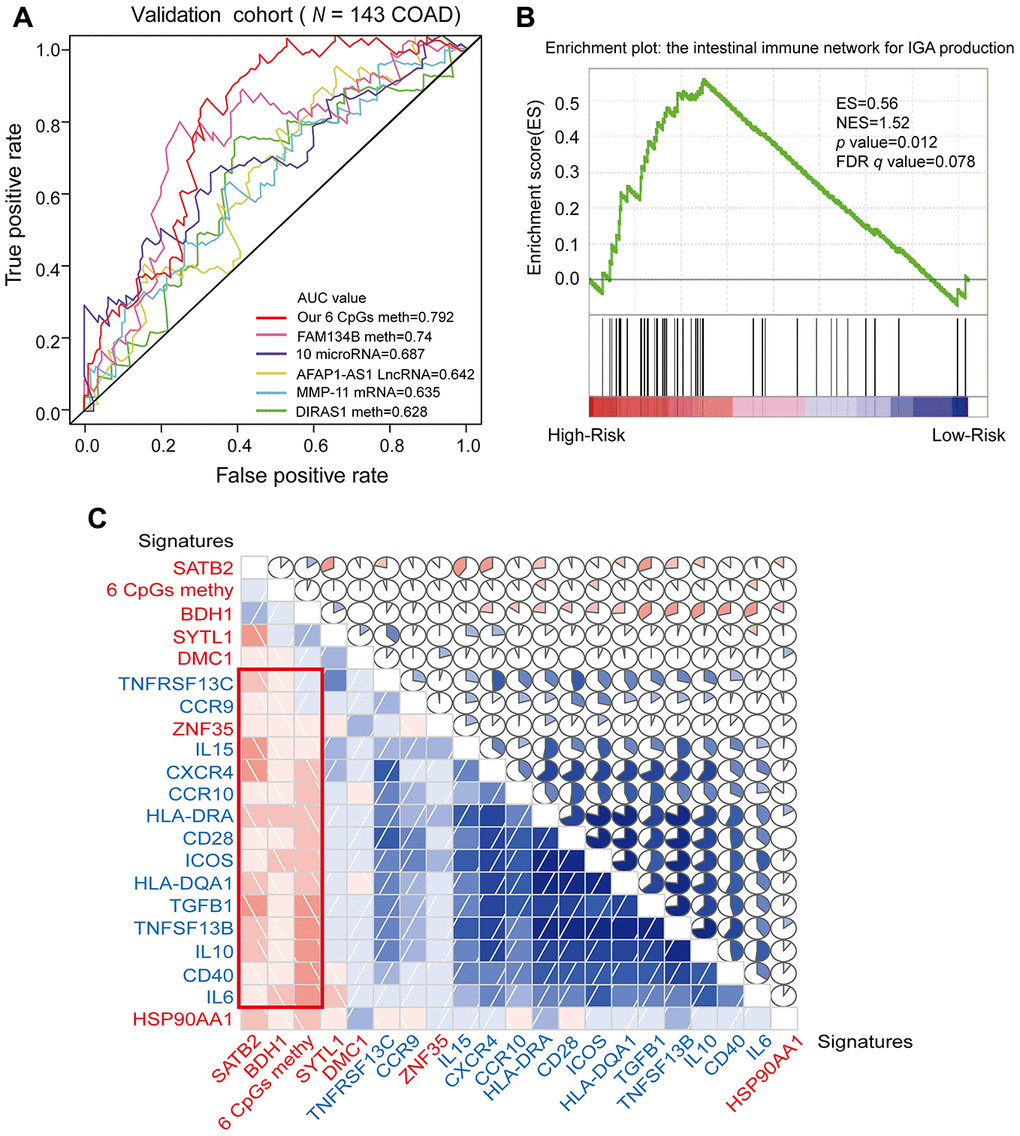 Next, we performed a gene set enrichment analysis (GSEA) on the high- and low-risk groups that had been classified according to the median risk score. The pathways that correlated significantly with risk are illustrated in Figure 8B, Supplementary Figure 3 and Supplementary Table 7 (enrichment score [ES] > 0.4, |normalized enrichment score [NES]| > 1, p-value < 0.05 and FDR q-value < 0.25). We selected the intestinal immune network for IgA production (IINIP) for further analysis, since this pathway is known to be involved in COAD. The core enrichment genes of the IINIP pathway were obtained via GSEA (Supplementary Table 8). To determine whether the genes corresponding to the combined COAD prognostic biomarkers functioned in IINIP pathways, we conducted a one-to-one correlation analysis on the expression of the core enrichment genes from the IINIP pathway, the combined methylation level of our prognostic model and the expression of the genes corresponding to the individual CpG sites of the COAD prognostic biomarkers (Figure 8C and Supplementary Figure 4). As expected, the expression of BDH1 and SATB2 and the combined methylation level of our COAD prognostic model based on six CpG sites correlated significantly with the IINIP signaling pathway (p < 0.05). The above results indicated that our combined COAD prognostic model not only accurately predicted prognosis, but also included CpG sites that may directly or indirectly influence the IINIP pathway.