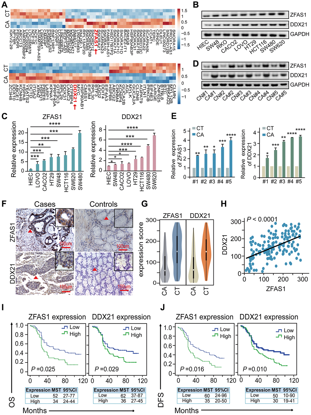 To explore the dysregulated lncRNAs-mRNAs enrichment and their correlations, we performed differential expression profiling analysis between CRC patients’ tissues and matched tumor-adjacent control tissues (n = 3) upon Affymetrix GeneChip microarray dataset that obtained the accession number GSE137511 (https://www.ncbi.nlm.nih.gov/geo/query/acc.cgi?acc=GSE137511). We firstly detected the significant differences between the two groups by fold change ≥ 2 and P value < 0.05, as illustrated in Figure 1A and Supplementary Table 8. Specifically, we demonstrated that lncRNA-ZFAS1 was remarkably up-regulated (log2 Fold Change/FC = 6.65) in the CRC tissues. Thereafter, we detected the potential target indicators including DDX21, DDX10, DDX31, IGTA2, and LAMC2 in CRC cells by qPCR assay (Supplementary Figure 1A). Importantly, DDX21 was the most significant decreased after ZFAS1 knockdown in both SW620 and SW480 CRC cells, shown in the Supplementary Figure 1A, and the log2 FC values were 6.85 in the microarray dataset (Supplementary Table 9). Consistent with our findings, a significant higher expression of lncRNA-ZFAS1 and DDX21 was observed in the vast majority of cancers, including CRC based on the TCGA dataset (Supplementary Figure 1B, 1C). Next, we demonstrated the expression levels of lncRNA-ZFAS1 and DDX21 in CRC cells and our included paired CRC patient’s tissues. As expected, the examination results were obtained that lncRNA-ZFAS1 and DDX21 showed significantly increased in CRC cells including LOVO, CACO2, HT29, SW48, HCT116, SW620, and SW480 compared with that in the normal control HIEC cells assayed by RT-PCR, qPCR method (Figure 1B, 1C). Similarly, RT-PCR and qPCR method confirmed the elevated expression of lncRNA-ZFAS1 and DDX21 between 20 pairs of CRC tissues and matched adjacent-tumor controls (Figure 1D, 1E), suggesting the possibly positive correlation of lncRNA-ZFAS1 with DDX21 in CRC cells and tissues. Thereafter, we enlarged the CRC patient samples to further clarify the expression association of lncRNA-ZFAS1 and DDX21, which included 157 pairs of CRC tissues and matched tumor-adjacent control tissues detected by ISH and IHC assay (Figure 1F). Notably, the expression levels of lncRNA-ZFAS1 and DDX21 were both up-regulated in the cases in comparison to matched controls (Figure 1G). Consequently, a positive linear correlation expression pattern was confirmed between lncRNA-ZFAS1 and DDX21 (R2 = 0.2795, P < 0.0001), shown in Figure 1H.