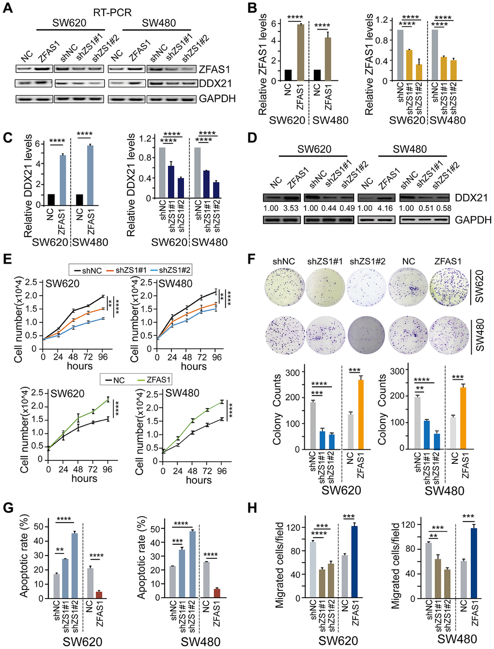 To further establish the regulation pattern of DDX21 and lncRNA-ZFAS1 involved in CRC biological characteristics, we firstly detected the expression levels of these two indicators after interfering lncRNA-ZFAS1 expression in both SW620 and SW480 cells. Our results demonstrated that ectopic lncRNA-ZFAS1 expression significantly prompted the DDX21 expression. Nevertheless, knockdown of lncRNA-ZFAS1 resulted in inhibition of the DDX21 expression both in SW620 and SW480 cells assayed by RT-PCR, qPCR, and western blot methods (Figure 2A–2D). Thereafter, cell number monitoring assays and colony formation assays (CFA) further revealed that lncRNA-ZFAS1 overexpression significantly enhanced the cell growth and colony formation capacity of SW620 and SW480 cells, whereas the lncRNA-ZFAS1 depletion suppressed the cell proliferative and colonic abilities of these two types of CRC cells (P < 0.0001, Figure 2E, 2F). Importantly, lncRNA-ZFAS1 depletion also resulted in an obvious elevated cellular apoptosis rates. In contrast, lncRNA-ZFAS1 overexpression substantially inhibited apoptosis rate both in SW620 and SW480 cells determined by flow cytometry, as shown in Figure 2G, and Supplementary Figure 2A. Moreover, Trans-well assay was conducted to detect the invasive abilities, and revealed that migrated cells of SW620 and SW480 cells were significantly suppressed while silencing lncRNA-ZFAS1 expression. Instead, ZFAS1 up-regulation dramatically elevated the invasive ability of SW620 and SW480 cells (Figure 2H, Supplementary Figure 2B). In addition, the cell proliferative abilities were inhibited and the cellular apoptosis rates were promoted after treated by DDX21 knockdown in SW620 and SW480 cells, shown in Supplementary Figure 2C, 2D.