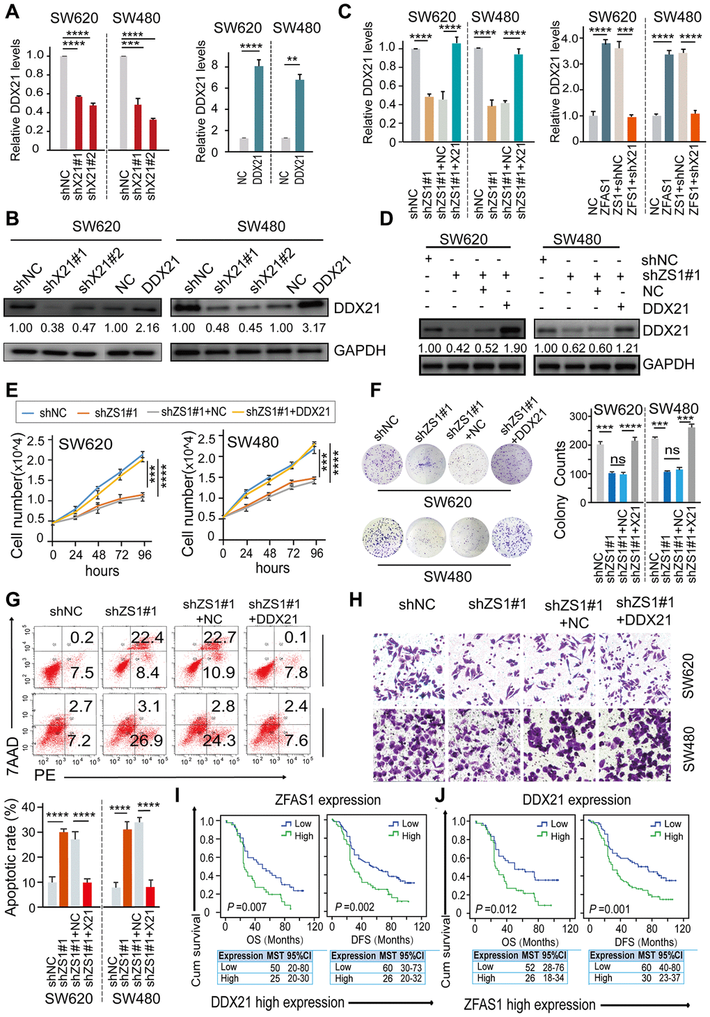 To further establish the influence of lncRNA-ZFAS1 on regulating DDX21 and their possible biological function in CRC cells, we carried out rescue experiments by up-regulating DDX21 expression in lncRNA-ZFAS1 knockdown CRC cells. Primarily, we detected the expression of DDX21 at mRNA and protein levels after treated by silencing or overexpression of DDX21 in SW620 and SW480 cells assayed by RT-PCR (Supplementary Figure 3A), qPCR and western-blot method (Figure 3A, 3B). Furthermore, the mRNA and protein levels of DDX21 were testified to achieve recovery expression caused by ZFAS1 knockdown upon DDX21 or overexpression ZFAS1 on silencing DDX21 compared with the NC group determined by qPCR and WB assays both in SW620 and SW480 cells (Figure 3C, 3D). Similarly, in vitro rescue experiments revealed that DDX21 overexpression reversed the facilitated effect on CRC molecular characteristics including cell proliferation ability, cell colony formation capacity, cell migration ability, and apoptotic rates in both SW620 and SW480 cells assayed by cell number monitoring (Figure 3E), CFA assay (Figure 3F), flow cytometry analysis (Figure 3G) and Trans-well (Figure 3H and Supplementary Figure 3B), respectively. More importantly, stratified prognostic analysis in our included cohort (n = 157) revealed that in the subgroup of harboring DDX21 high expression patients, lncRNA-ZFAS1 high expression patients were significantly associated with a shorten OS (P = 0.007, high expression: MST = 25 months, low expression: MST = 50 months) and DFS (P = 0.002, high expression: MST = 26 months, low expression: MST = 53 months) (Figure 3I). Consistently, stratification of lncRNA-ZFAS1 high expression subgroup also confirmed the synergistic prognostic values on DDX21 high expression cohort showing a poor clinical outcomes including OS (P = 0.012, high expression: MST = 26 months, low expression: MST = 52 months) and DFS (P = 0.001, high expression: MST = 30 months, low expression: MST = 60 months) (Figure 3J).