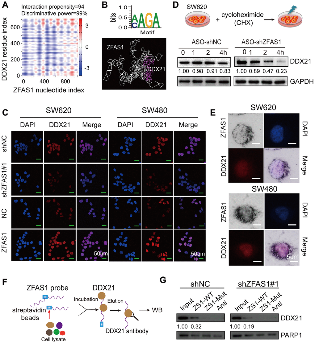Thus, these data supported that ZFAS1 regulated DDX21 expression by direct binding manner through specific recognizing motif, and this recruitment significantly impacted CRC tumorigenesis and development.