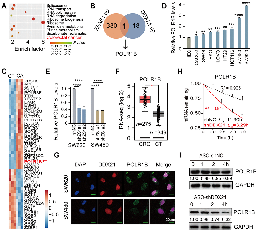 To further excavate the downstream regulation axis of DDX21 involved in lncRNA-ZFAS1 functions in CRC cells and tissues, we employed the enrichment of co-expression target genes and the top 10 cellular function components including RNA transport, RNA polymerase, and colorectal cancer analyzed by KEGG and GO analysis (Figure 5A). It was noteworthy that POLR1B was exactly appeared in the intersection of co-expression downstream genes between lncRNA-ZFAS1 up-regulation and DDX21 up-regulation (Figure 5B). Consistently, STRING website (https://string-db.org/) was applied for searching with potential downstream target genes of DDX21 protein. Interestingly, the POLR1B, the critical components of Pol I RNA polymerase complex, occurred in the DDX21 protein interaction networks, as shown in Supplementary Figure 4A. Furthermore, the heat-map cluster also identified a dramatic up-regulation of POLR1B based on our Affymetrix GeneChip microarray (n = 3) (Figure 5C, Supplementary Table 11). Similar results further established that POLR1B expression was significantly increased in these included CRC cells such as SW480, SW620, HCT116, SW48, CACO2, LOVO, HT29, and RKO cells compared with HIEC cells assayed by qPCR and RT-PCR method (Figure 5D, Supplementary Figure 4B). Further qPCR assay provided evidence that POLR1B was significant regulated by interfering ZFAS1 expression both in SW620 and SW480 cells (Figure 5E). A consistent expression pattern of POLR1B was also confirmed in majority of cancers including colorectal cancer upon the TCGA dataset (http://gepia.cancer-pku.cn/) (Figure 5F, Supplementary Figure 4C). Co-localization and co-expression assayed subsequently detected the similarly cellular distribution and localization of POLR1B and DDX21, which mainly located in the cellular nucleus of SW620 and SW480 cells (Figure 5G). Moreover, we conducted the RNA stability assays with the treatment of actinomycin D (ActD). As expected, the half-life of POLR1B mRNA decay was reduced after knockdown DDX21 expression in SW620 cells (Figure 5H). In agreement with these findings, the protein expression levels of POLR1B were measured after treatment with the CHX, and we observed that the expression levels gradually decreased throughout this time course (0, 1, 2, 4 hours) in SW620 cells (Figure 5I).