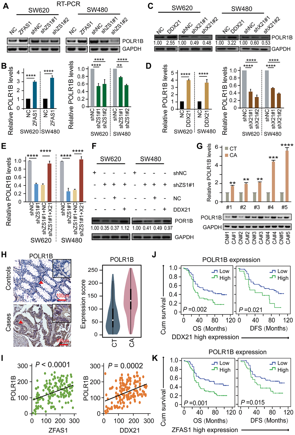 To elucidate the underlying critical role of POLR1B regulated by DDX21 and lncRNA-ZFAS1, we therefore examined the impact of lncRNA-ZFAS1 and/or DDX21 on POLR1B expression in CRC cells and paired matched CRC tissue samples. Specifically, overexpression of lncRNA-ZFAS1 dramatically prompted the mRNA and protein expression, however, lncRNA-ZFAS1 knockdown resulted in an inhibition of the POLR1B expression in both SW620 and SW480 cells detected by qPCR and western blot assay (Figure 6A, 6B). Consistent with these results, ectopic DDX21expression dramatically enhanced POLR1B expression, whereas DDX21 depletion remarkably deceased the POLR1B expression at mRNA and protein levels in SW620 and SW480 cells (Figure 6C, 6D). Importantly, based on exhibited combined pcDH-DDX21 and ZFAS1 silencing vector, POLR1B expression was almost rescued to the normal levels at both RNA and protein expression, illustrated in Figure 6E, 6F. Consistent with the results obtained from the CRC cells, significant high expression of POLR1B was observed in 20 pairs of CRC tissues and matched tumor-adjacent controls using qPCR and RT-PCR assay (Figure 6G). Thereafter, we detected the expression of POLR1B, and assessed possibly correlation with LncRNA-ZFAS1 or DDX21 in this included relative large samples containing 157 paired of CRC tissues and matched tumor-adjacent control tissues by TMA and IHC assays (Figure 6H). As expected, an obviously increased POLR1B expression was determined in CRC tissues based on the cut-off values assessed by ROC curve method (Figure 6H, Supplementary Figure 5A). Of all clinicopathological features considered for this cohort, we found that the high expression of POLR1B was significantly associated with the CRC tumor size (P = 0.002), indicating high expression of POLR1B was related to malignant progression in CRC patients, shown in Supplementary Table 12. More importantly, a positive linear correlation regression manner was confirmed between POLR1B and lncRNA-ZFAS1 expression and DDX21 expression (Figure 6I). Notably, Kaplan-Meier analysis indicated that high expression of POLR1B was markedly associated with worse DFS (P=0.001) and OS (P=0.002) (Supplementary Figure 5B). The independent prognostic value of POLR1B expression was further established in the multivariate Cox proportional hazard model after adjusting for confounders (Supplementary Table 10). More importantly, stratified prognostic analysis in our included cohort (n = 157) revealed that POLR1B high expression showed a dramatically shorten OS (P = 0.002) and DFS (P = 0.021) in the subgroup of DDX21 high expression patients (Figure 6J, Supplementary Figure 5C). Similarly, stratification of ZFAS1 high expression subgroup also confirmed the synergistic prognostic values of POLR1B high expression cohort showing a poor clinical outcomes including OS (P = 0.001) and DFS (P = 0.015) (Figure 6K, Supplementary Figure 5C). Therefore, the findings strongly supported that a critical novel ZFAS1-DDX21-POLR1B signaling axis exerted their molecular function by involvement of CRC initiation and development.