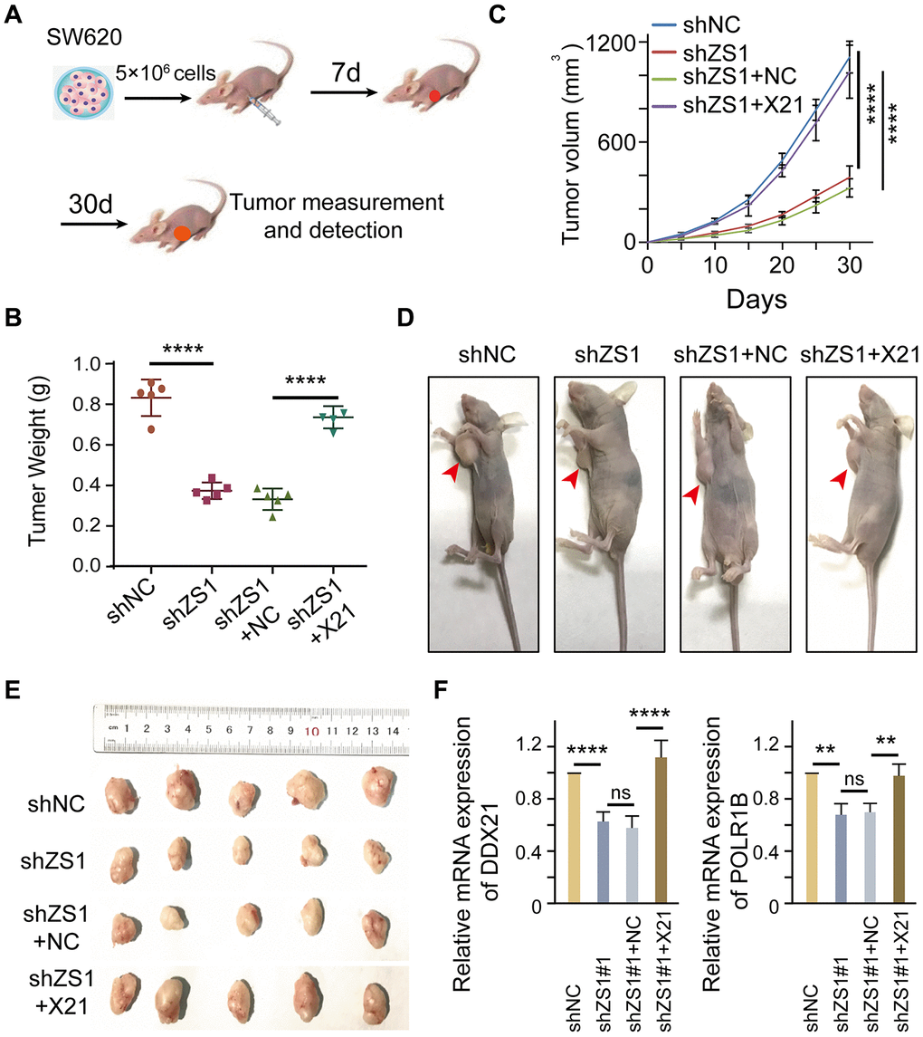 To evaluate the molecular function of ZFAS1 interacting with DDX21 in vivo, we established xenografts in BALB/c nude mice by inoculating SW620 cells that were stably transfected with shZFAS1, shZFAS1+ pcDH-DDX21, empty-vector (shNC), and shZFAS1+NC. A total of 5×106 cells were subcutaneously implanted into the right armpits of the four-week male mice (Figure 7A). The mice were sacrificed, and the xenograft tumors were removed at the sixth week after implantation. Ex vivo assessment of xenograft tumor weight and volume showed a significant change between the treated mice and the control mice after 4 weeks of growth (Figure 7B–7E). Specifically, ZFAS1 depletion results in a dramatically suppression in tumor weight at the days of 30 compared with the NC group. However, the reduced tumor weight almost recovered to the levels of NC group after transfected with pcDH-DDX21 vector in the knocking-down ZFAS1 xenograft tumor mice (Figure 7B). Similarly, the volume of xenograft tumor was monitored once every 5 days and the results showed than ZFAS1 silencing inhibited the growth speed or development of the SW620 cells in xenografts, nevertheless, no significant difference of the tumor volume were determined between shZFAS1+pcDH-DDX21 group and shNC group (Figure 7C), and the representative nude mice and all of the xenograft tumors exhibited in Figure 7D and 7E. Thus, knocking-down ZFAS1 and then overexpressing DDX21 tumors displayed the promotion of cell growth in vivo. To further confirm this, qPCR assay indicated that DDX21 was significantly increased in the group co-transfected with shZFAS1 and DDX21 vector. Importantly, the target gene POLR1B mRNA expression showed a significantly elevated by the presence of shZFAS1 and DDX21 (Figure 7F), indicating the promotion is a result of ZFAS1 interacting with DDX21in xenograft mice tumors. Therefore, the results demonstrated that ZFAS1 knockdown inhibits CRC cell proliferation for targeting DDX21/PLOR1B signaling axis in vivo.