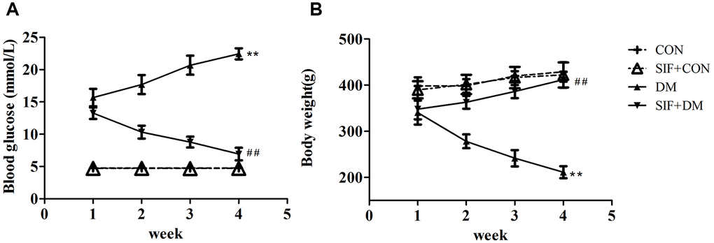 First, we detected the blood glucose levels and body weights of the rats, and we unexpectedly observed that SIF could reduce the blood glucose levels and increase the body weights of the diabetic rats, suggesting that SIF could improve the blood glucose levels and body weights of diabetic rats.