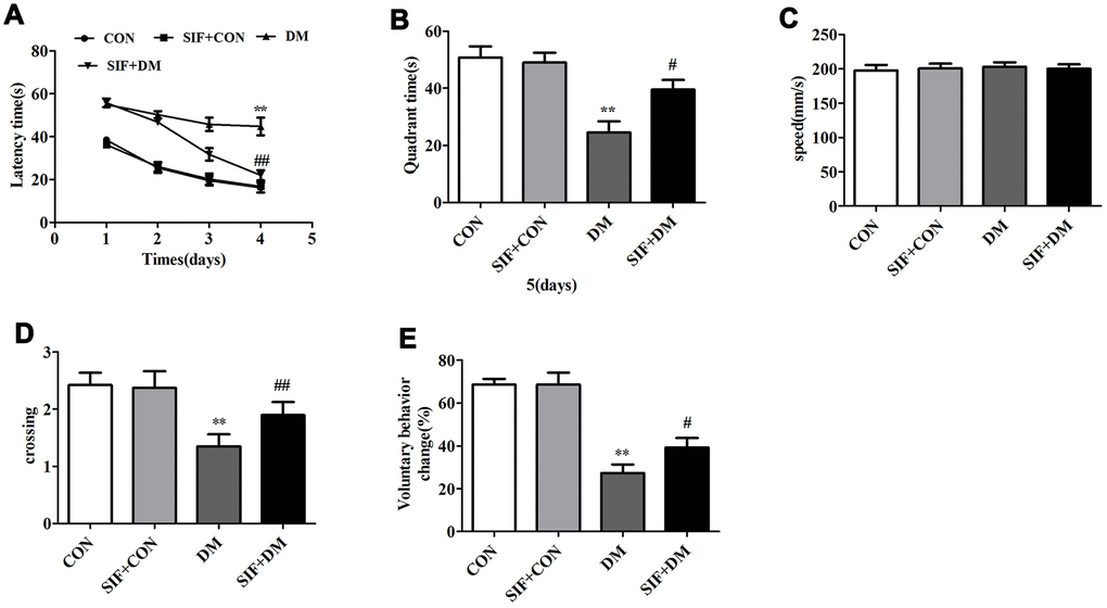 The hippocampus-dependent cognitive abilities of the rats were tested by the MWM hidden platform task. Figure 2A shows the effects of SIF administration on the learning and memory abilities of the rats during latency trials. The rats in the DM group spent a longer time searching for the hidden platform during days 1-4 of the latency trials. However, the rats in the SIF+DM group spent obviously less time searching for the platform than the rats in the DM group. On day 5, in the probe test, the platform was removed, and the rats in SIF+DM group spent less time in the target quadrant than the rats in the CON group. The SIF-treated rats spent more time in the target quadrant (Figure 2B). We also measured the number of times the rats crossed the platform, and the crossing times in the DM group were lower than those in the CON group. We also found that the rats in the SIF+DM group crossed the platform more frequently (Figure 2D). Nevertheless, in the whole test, all the rats’ swimming speeds were not significantly different (Figure 2C). As shown in Figure 2E, the voluntary behavior change of the GK rats was significantly lower than that of the CON rats; however, SIF reversed this phenomenon. The behavioral results indicated that the learning and memory abilities of the diabetic rats were significantly impaired, and SIF contributed greatly to the improvement of the learning and memory impairment in the GK rats.