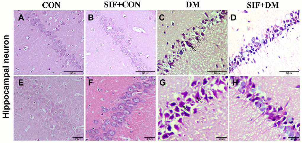 We used HE staining to investigate the morphologically intact neurons in the CA1 region of the hippocampus. In the hippocampus, compared to the CON group, the DM group exhibited a greater number of pyramidal cells with shrunken or irregular shapes and deeper staining (Figure 3C, 3G). Treatment with SIF reduced the number of dead cells (shrunken or irregular shape and deeper staining) in the rats with diabetes (Figure 3D, 3H). Our results showed that the morphology of hippocampal neurons in the GK rats was significantly abnormal, and the morphological abnormalities of these hippocampal neurons were improved by SIF administration, suggesting that the improvement of cognitive impairment by SIF was achieved by improving the abnormalities of the hippocampal neurons in GK rats.