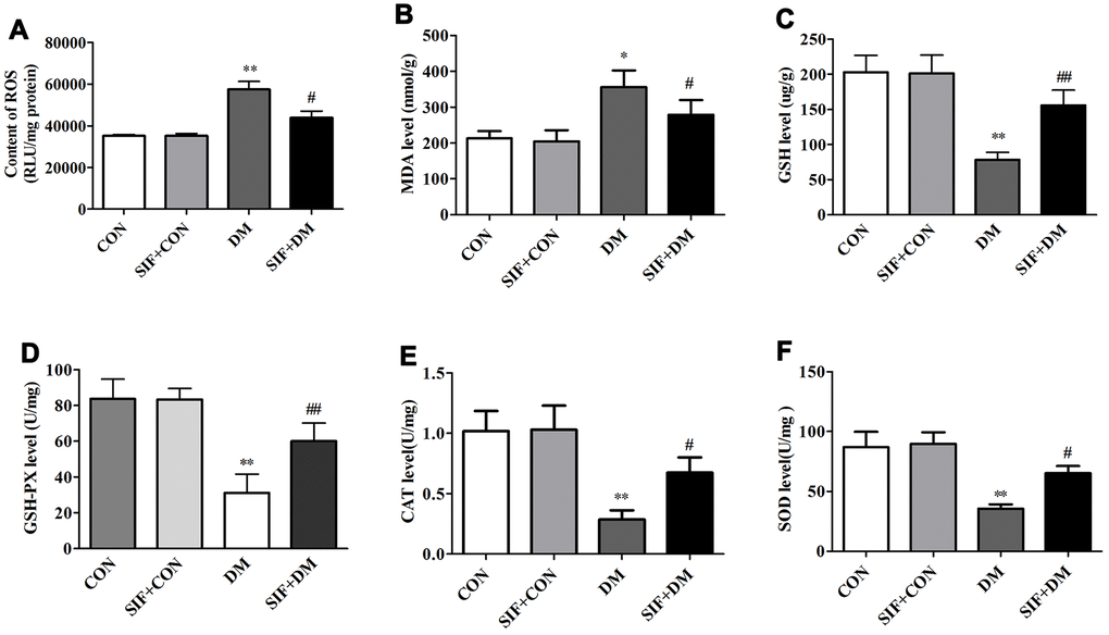 To explore the mechanism underlying the neuroprotective effect of SIF, we measured the level of ROS and the oxidative stress markers MDA, GSH, GSH-PX, CAT and SOD in the hippocampus of the experimental animals. As shown in Figure 4A, the ROS levels in the rats in the DM group were higher than those in the rats in the CON group. However, the level of ROS significantly decreased after SIF treatment. The level of MDA was significantly increased (Figure 4B) and the levels of GSH, GSH-PX, CAT and SOD was significantly decreased in the hippocampus of the DM rats (Figure 4C–4F). Post treatment with SIF could ameliorate the DM-induced oxidative stress while decreasing the level of MDA (Figure 4B) and increasing the levels of GSH, GSH-PX, CAT and SOD in the hippocampus (Figure 4C–4F). Our results suggest that the cognitive impairment of diabetic rats may be related to oxidative stress, which is consistent with previous studies [24]. After SIF treatment, the indicators of oxidative stress in the diabetic rats showed a positive trend, suggesting that SIF may improve the cognitive dysfunction of diabetic rats by reducing oxidative stress.