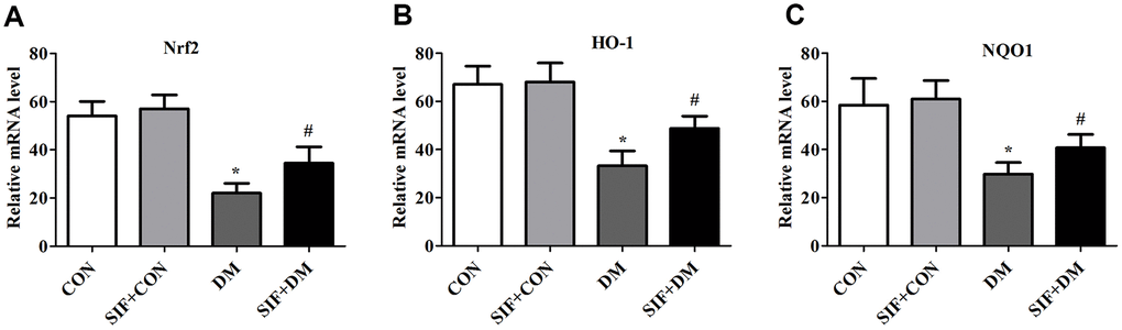Oxygen free radicals can cause cellular lipid peroxidation reactions to further generate MDA, and the MDA level in the cell indirectly reflects the metabolism of oxygen free radicals and the degree of cell damage by free radicals [35]. Under physiological conditions, there are natural free radical-scavenging systems in the body, such as glutathione peroxidase (GSH-Px), SOD, and GSH [36]. Under physiological conditions, Nrf2 and Keap1 in the cell combine to block the activity of Nrf2; under oxidative stress conditions, the Nrf2 and Keap1 complex dissociates, and Nrf2 leaves the cytoplasm to enter the nucleus. In the nucleus, Nrf2 combines with ARE, initiates the expression of phase II detoxification enzyme and antioxidant enzyme genes that are regulated by ARE, and promotes the resistance of cells to oxidative stress and nucleophilic compounds. The antioxidant genes regulated by ARE encode proteins, including HO-1 and GSH [37]. These molecules can protect the body from reactive oxygen species-mediated damage [37]. Nrf2 activation induces the synthesis of a series of antioxidant enzymes (including HO-1) to promote unbalanced redox reactions, to restore balance, and to reduce free radical damage [38–39]. Compared with that of the CON group, the MDA content of the DM group was significantly increased; in addition the GSH level and the SOD, GSH-px and CAT activities were significantly reduced. After SIF treatment, the MDA content was significantly reduced, the GSH level was significantly increased, and the SOD, GSH-px and CAT activities were significantly increased. The RT-PCR and Western blot test results showed that compared with the DM group, the SIF+DM group exhibited significantly up-regulated Nrf2, HO-1, and NQO-1 protein and mRNA levels, indicating that SIF has antioxidant effects. The mechanism of broken damage may be related to the activation of the Nrf2/HO-1 signalling pathway.