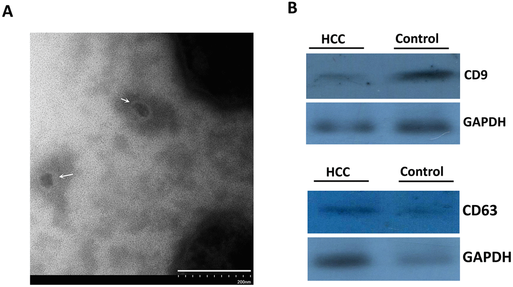 The extraction process was summarized in Figure 1. TEM showed that the size of exosomes derived from serum ranged from 30 to 150 nm in diameter and featured small vesicles with membrane structures, which were consistent with the morphological characteristics of exosomes (Figure 2A). To confirm whether exosomes were successfully isolated and purified, expressions of exosome marker proteins CD9 and CD63 were determined by western blot. The results showed that CD9 and CD63 could be detected in the eluate containing serum exosomes of both HCC patients and healthy controls (Figure 2B). This suggested that exosomes extraction was successful.