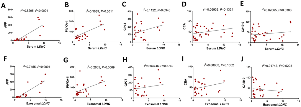 The correlation analysis showed that serum LDHC levels were positively correlated with the levels of AFP (r2 = 0.8295, P < 0.0001) and PIVKA-II (r2 = 0.3639,P = 0.0011) (Figure 4A, 4B). Exosomal LDHC levels were correlated with the levels of AFP (r2 = 0.7455, P < 0.0001) and PIVKA-II (r2 = 0.2665, P < 0.0001) in HCC cases (Figure 4F, 4G). However, there were nonsignificant correlations between serum and exosomal LDHC levels and clinicopathological indicators such as gender, age, tumor size (all P > 0.05, data not shown), as well as serum levels of carcino-embryonic antigen (CEA), Golgi protein 73 (GP-73), and glycoprotein antigen 199 (CA19-9) (Figure 4C–4E, 4H–4J).