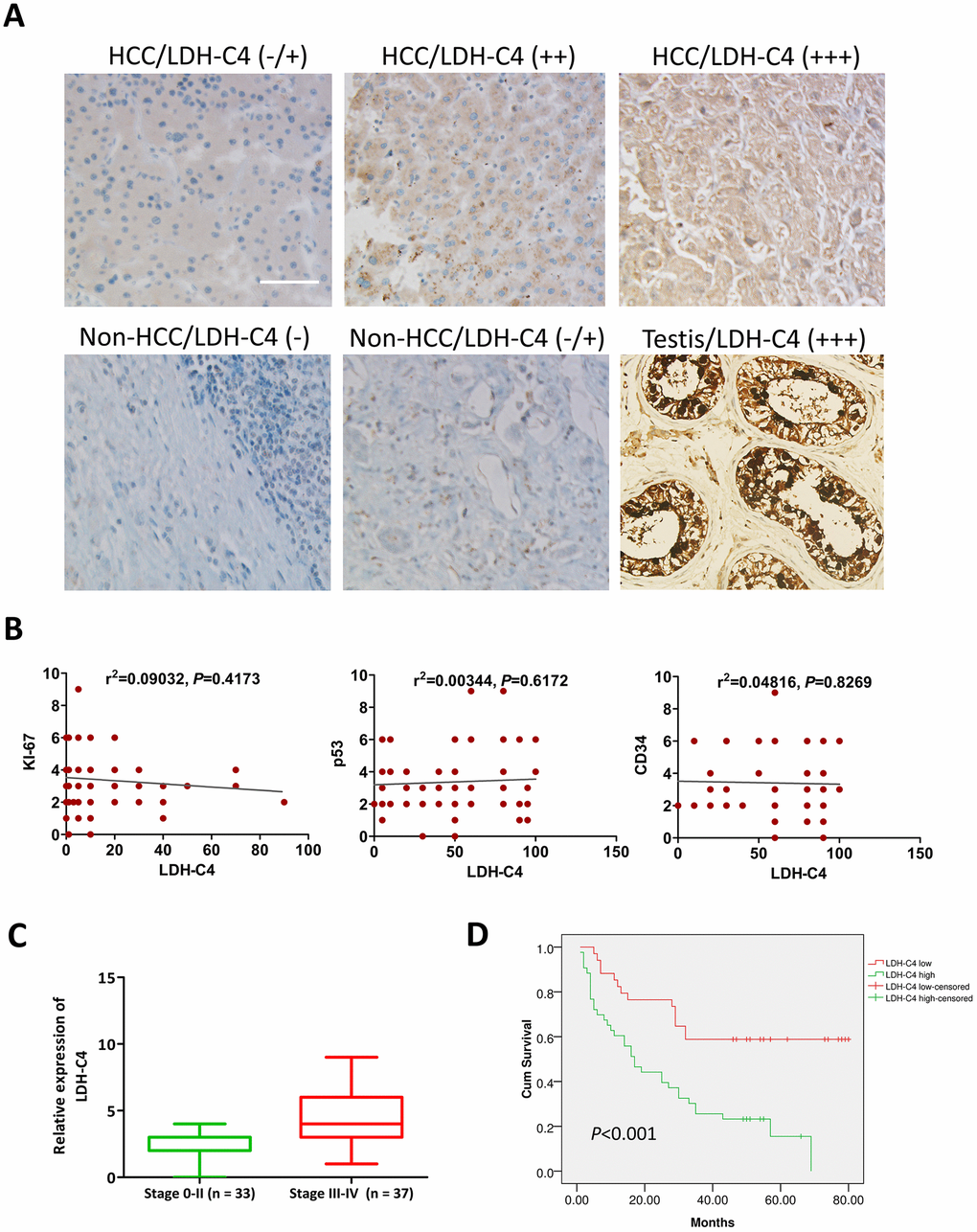 It was found that LDH-C4 was mainly localized in the cytoplasm of HCC cells, which was significantly up-regulated in HCC tissues (Figure 6A). The proportion of LDH-C4 high expression (+ + / + + +) in HCC tissues accounted for 55.84% (43 / 77), which was significantly higher than that in para-carcinoma tissues (26.32%, 20/76) (P < 0.0001). The correlation analysis showed that LDH-C4 levels were positively correlated with clinical stage (P = 0.002) and mass size (P = 0.023) of HCC (Table 1), but not related to KI-67, p53 and CD34 levels (Figure 6B). Moreover, LDH-C4 staining score was higher in stage 0-II HCC patients than that in stage III-IV HCC patients (Figure 6C). The Kaplan-Meier analysis showed that the overall survival of patients in the LDH-C4 low expression group was significantly prolonged compared with the LDH-C4 high expression group, while the prognosis of patients in the LDH-C4 high expression group was worse than that in the low expression group (P < 0.001) (Figure 6D). The COX regression model analysis showed that LDH-C4 was an independent risk factor for HCC prognosis (P = 0.016) (Table 2).