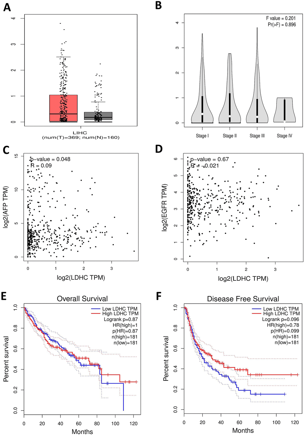 We also assessed the clinical significance of LDHC expressions in HCC based on GEPIA data that from TCGA. We found that LDHC levels were elevated in HCC tissues compared with non-cancer controls (Figure 7A), and also highly expressed in stage I-IV HCC patients (Figure 7B). The correlation analysis showed that LDHC expressions were positively associated with AFP levels (P = 0.048, Figure 7C), but not correlated with EGFR expressions in HCC patients (Figure 7D). The survival analysis showed that LDHC in HCC tissues was a nonsignificant predictor for OS and DFS of HCC patients (Figure 7E, 7F).