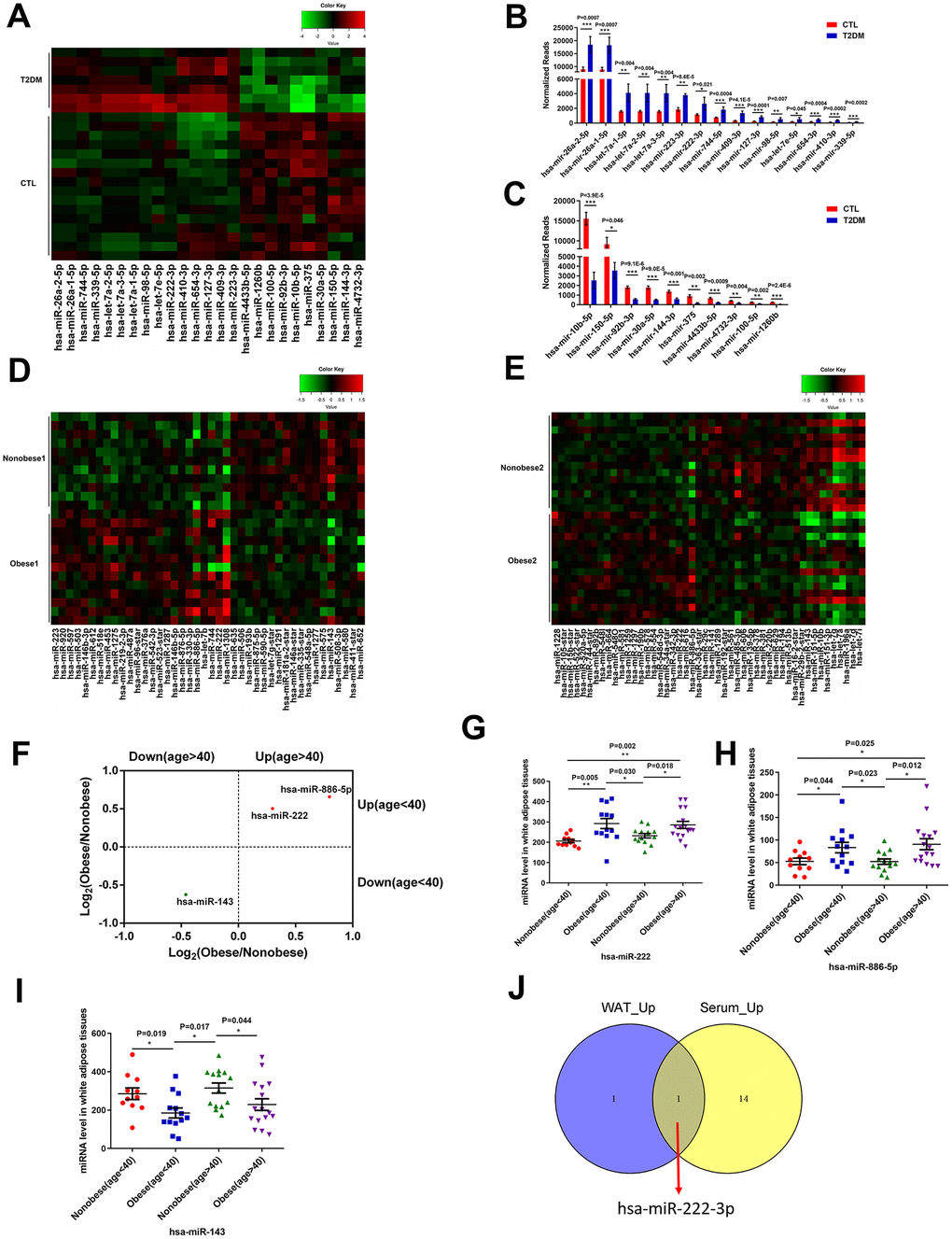 We compared the differentially expressed miRNAs in the serum samples from the T2DM patients and WAT samples from the young and older obese patients and found that miR-222 was significantly upregulated in the serum samples from T2DM patients and the WAT samples from obese patients (Figure 1J).
