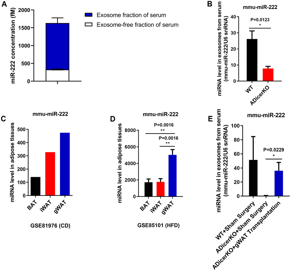 We then analyzed if gWAT was the major source of serum exosomal miR-222. GitHub database analysis showed that serum exosomal miR-222 levels from the ADicerKO mice that underwent sham surgery were significantly reduced compared to those from wild-type mice (Figure 2E). However, serum exosomal miR-222 levels were restored to 70% of normal in the ADicerKO mice after receiving gWAT transplants (Figure 2E). These data suggest that serum exosomal miR-222 is mostly derived from the gWAT.