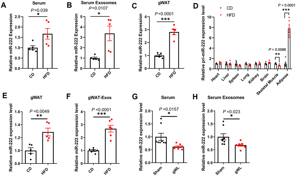 We then surgically harvested gWAT from the CD- and HFD-fed mice and cultured them in vitro. After 48 h of culture, we analyzed the levels of miR-222 in the gWAT tissue slices and the exosomes in the culture medium. The miR-222 levels were significantly higher in the cultured gWAT tissue slices and the gWAT-derived exosomes from HFD-fed mice compared to those from the CD-fed mice (Figure 3E, 3F). Next, we surgically removed the gWAT from the HFD mice at 8 weeks after HFD-diet and measured the levels of miR-222 in the serum and serum exosomes of gWAT-lipectomized (gWL) and sham-operated (sham) HFD-fed mice after 1 week. The miR-222 levels were significantly lower in the serum and serum exosomes of the gWL-HFD mice compared to those in the sham-HFD mice (Figure 3G, 3H). Taken together, these results demonstrate that gWAT is a major source of increased miR-222 levels in the serum and serum exosomes of HFD-fed obese model mice.