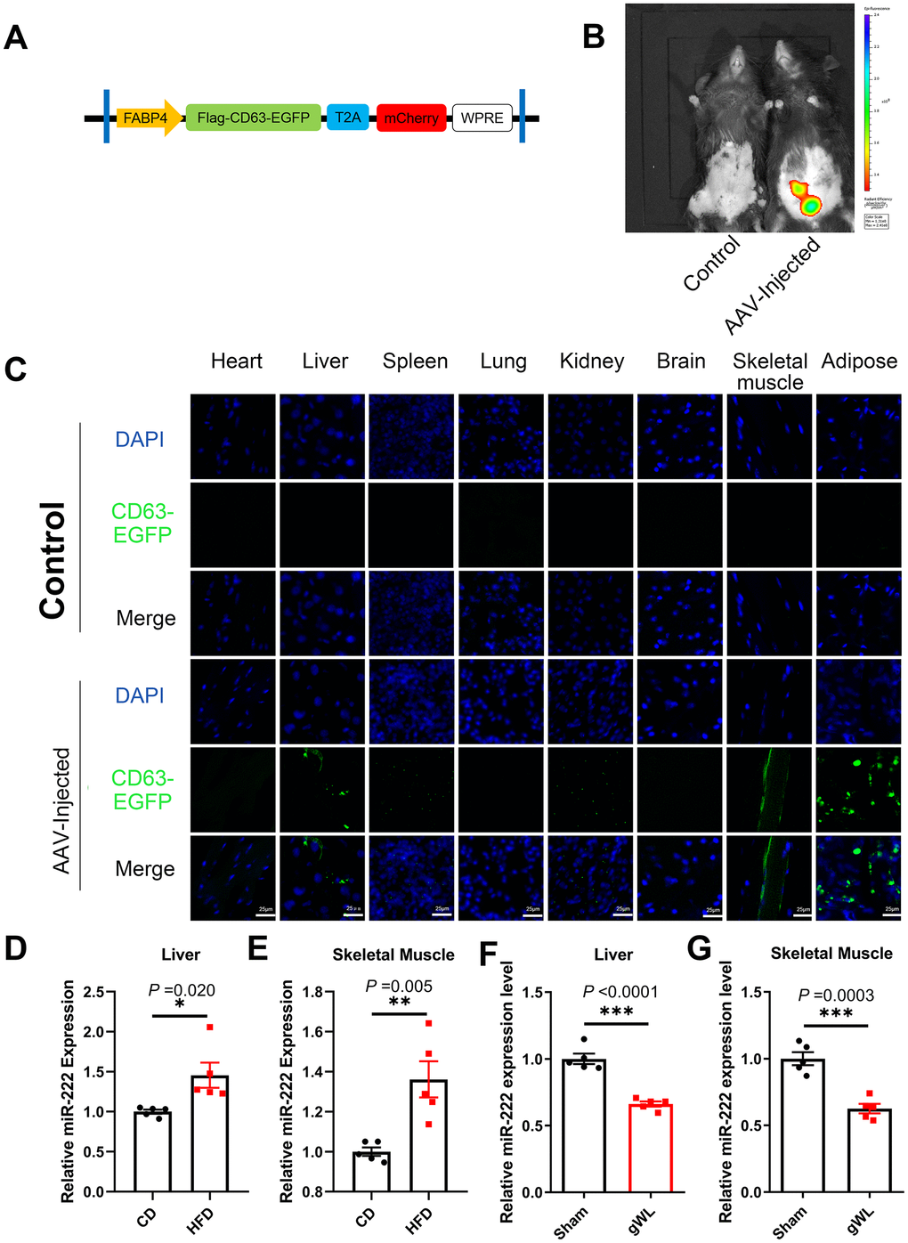 Next, we analyzed the target tissues of gWAT-derived exosomal miR-222 by constructing an adeno-associated vector (AAV) expressing a fusion protein CD63-EGFP and an indicator protein mCherry under a FABP4 promoter (Figure 4A). We injected the AAV viruses in situ into the gWAT of HFD-fed mice at 8 weeks after HFD-diet. At 8 weeks after injection, in vivo imaging results showed that mCherry was expressed only in the gWAT of AAV-injected mice (Figure 4B). Therefore, gWAT was the only source tissue that produced EGFP-labeled exosomes. Then, at 8 weeks after injection, we performed confocal microscopy and observed EGFP fluorescence in the liver, spleen, kidney, skeletal muscle and gWAT of the AAV-injected mice (Figure 4C). These results suggest that gWAT-derived exosomes are transported to the liver, spleen, kidney and skeletal muscle tissues. Moreover, EGFP fluorescence was significantly higher in the liver and skeletal muscle tissues, which are also the major target tissues for insulin to maintain glucose homeostasis. Therefore, we focused on the liver and skeletal muscle tissues in our further experiments.