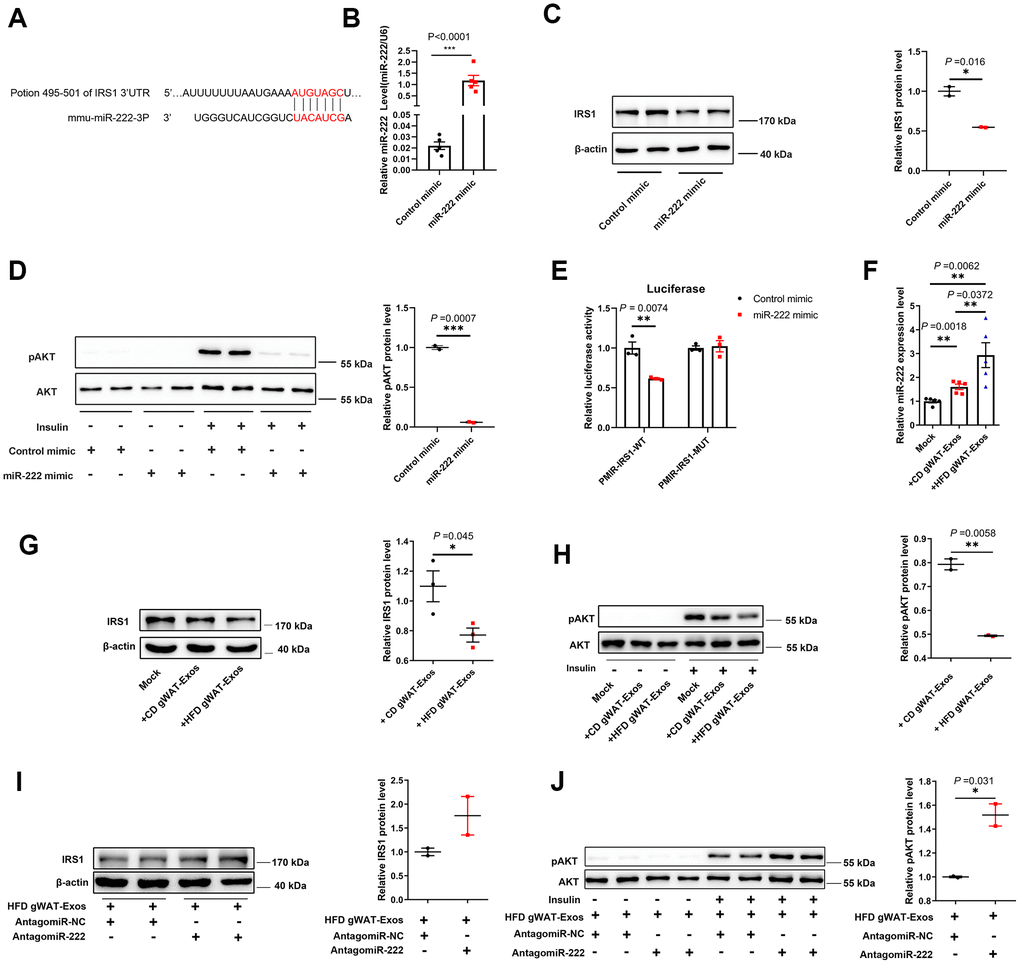 We then investigated if the exosomal miR-222 that inhibits IRS1 expression in the Hepa 1-6 cells was derived from adipose tissues. Towards this, we co-cultured Hepa 1-6 cells with CD-gWAT-Exos or HFD-gWAT-Exos and analyzed the Hepa 1-6 cells. QRT-PCR results showed that miR-222 levels were significantly higher in the Hepa 1-6 cells co-cultured with HFD-gWAT-Exos compared to those co-cultured with CD-gWAT-Exos (Figure 5F). Furthermore, IRS1 protein levels and insulin-induced phospho-AKT levels were significantly reduced in the Hepa 1-6 cells co-cultured with HFD-gWAT-Exos compared to those co-cultured with CD-gWAT-Exos (Figure 5G, 5H and Supplementary Figure 7). To further verify, we co-cultured antagomiR-NC- or antagomiR-222-transfected Hepa 1-6 cells with HFD-gWAT-Exos. The IRS1 and phospho-AKT protein levels were significantly higher in the antagomiR-222-transfected Hepa 1-6 cells co-cultured with HFD-gWAT-Exos compared to the antagomiR-NC-transfected Hepa 1-6 cells co-cultured with HFD-gWAT-Exos (Figure 5I–5J). These results confirm that the gWAT-derived exosomal miR-222 promotes insulin resistance by suppressing IRS1 protein expression.