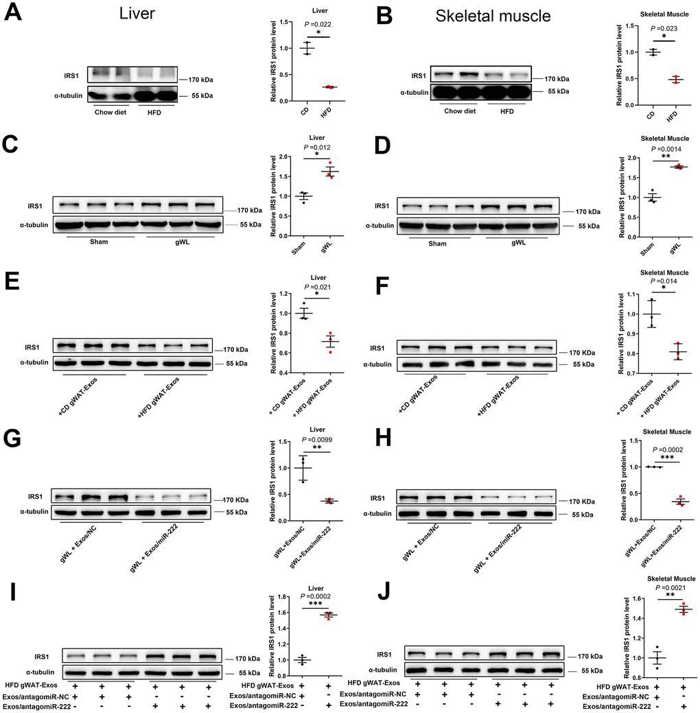Liver and skeletal muscles are the major target tissues of gWAT-derived exosomal miR-222 in obese model mice. Therefore, we tested if the gWAT-derived exosomal miR-222 induces insulin resistance in the liver and skeletal muscle tissues of HFD-fed obese model mice by repressing IRS1. We observed significantly higher miR-222 levels and reduced IRS1 in the liver and skeletal muscle tissues of the HFD-fed obese model mice. We further observed that IRS1 were significantly increased in the liver and skeletal muscle tissues of gWAT-lipectomized (gWL) obese mice, thereby confirming the essential role of gWAT in the repression effect on IRS1. Furthermore, the IRS1 protein levels in livers and skeletal muscles of wild-type mice were decreased by the injections of HFD-gWAT-Exos, demonstrating the repressing effect of HFD-gWAT-Exos on IRS1. Moreover, we observed that the IRS1 protein levels in the livers and skeletal muscles were significantly re-decreased by the injections of 293t-exosomes containing miR-222 mimics in gWL mice and significantly re-increased by injections with 293T-exosomes containing antagomiR-222 in HFD-gWAT-Exos injected mice. These results confirm that gWAT-exosomal miR-222 supresses IRS1 protein expressions in the liver and skeletal muscle tissues of HFD-fed obese model mice.