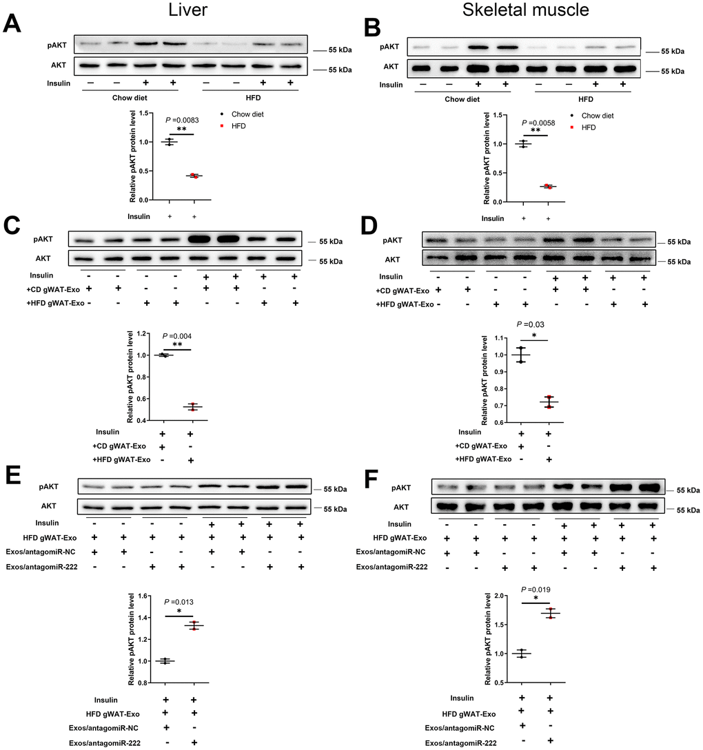 Next, we analyzed the levels of phosphorylated AKT (phospho-AKT or pAKT) in the liver and skeletal muscle tissues of insulin-induced HFD- and CD-fed mice using western blotting. The pAKT levels were significantly decreased in the liver and skeletal muscle tissues of insulin-induced HFD-fed male mice compared to the liver and skeletal muscle tissues in the insulin-induced CD-fed male mice (Figure 7A, 7B), and similar trends were also observed in HFD-fed female mice (Supplementary Figure 8C, 8D). Furthermore, pAKT levels were significantly reduced in the liver and skeletal muscle of wild-type mice injected with the HFD gWAT-Exos compared to the liver and skeletal muscle of wild-type mice injected with the CD gWAT-Exos (Figure 7C, 7D). Moreover, pAKT levels in the liver and skeletal muscle tissues were significantly higher in the wild-type mice that were injected with the HFD gWAT-Exos simultaneously injected with 293T-exosomes containing antagomiR-222 compared to those injected with the HFD gWAT-Exos simultaneously injected with 293T-exosomes containing antagomiR-NC (Figure 7E, 7F). These results further confirm that gWAT-derived exosomal miR-222 promotes insulin resistance in the liver and skeletal muscle tissues of the obese model mice by inhibiting the insulin signaling pathway via suppression of IRS1 protein expression (Figure 8).