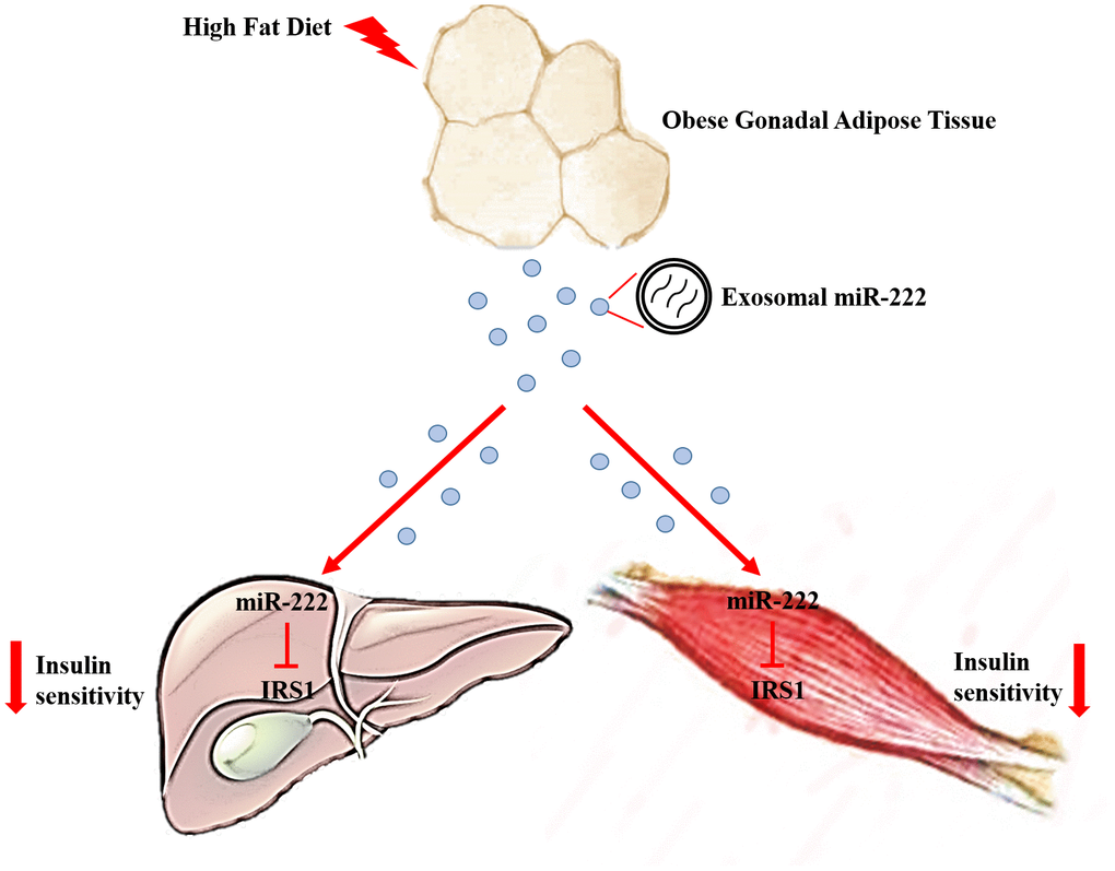 Obesity is a risk factor for the development of type 2 diabetes mellitus that occurs more frequently in individuals showing insulin resistance. In this study, we demonstrate that exosomal miR-222 secreted by the gonadal white adipose tissue (gWAT) promotes obesity-induced insulin resistance.