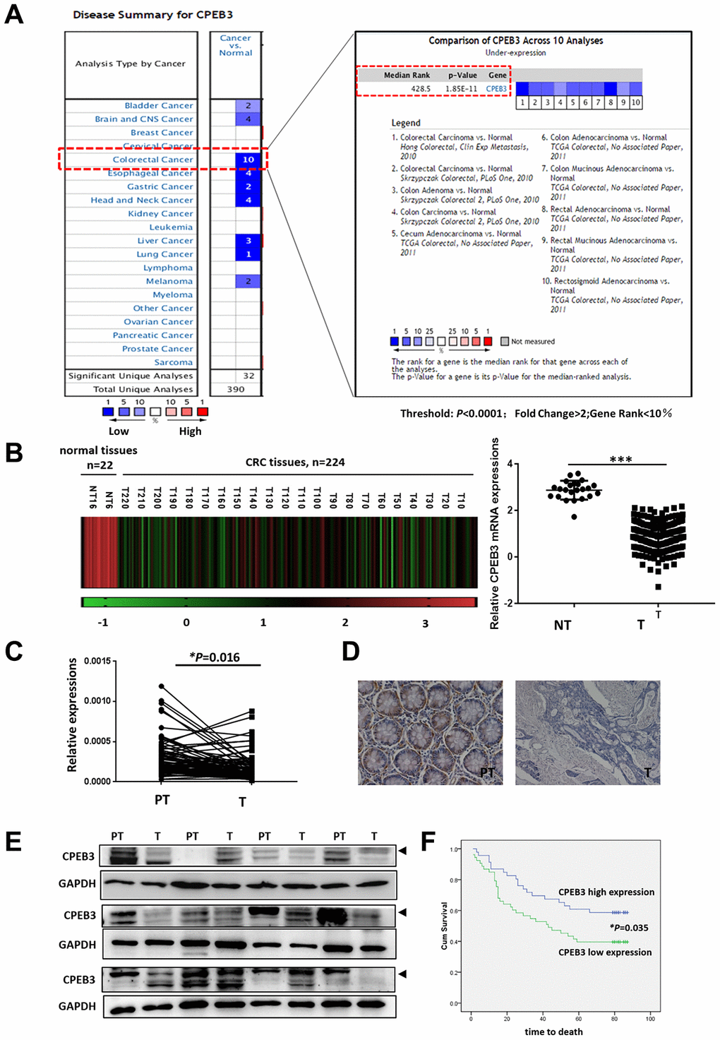 Figure 1. CPEB3 is frequently down-regulated in colorectal cancer tissues. (A) CPEB3 expression in colorectal cancer tissues and other tumors, based on previously published microarray data from the Oncomine database (threshold: P < 0.0001; fold change > 2; gene rank < 10%). (B) Analysis of CPEB3 gene expression in colorectal cancer and normal tissues in TCGA database (n = 246 [224 vs. 22]). (C) qPCR analysis of CPEB3 mRNA expression in human colorectal cancer tissues and matched peri-tumoral tissues (n = 84). (D) Representative immunohistochemical staining of CPEB3 in human colorectal cancer tissues (right) and matched peri-tumoral tissues (left). (E) Western blotting analysis of CPEB3 in human colorectal cancer tissues and matched peri-tumoral tissues (n = 12). (F) Patients in the CPEB3 low-expression group tended to exhibit shorter OS than patients in the high-expression group by Kaplan-Meier analysis (47 vs. 62 months; P = 0.035).