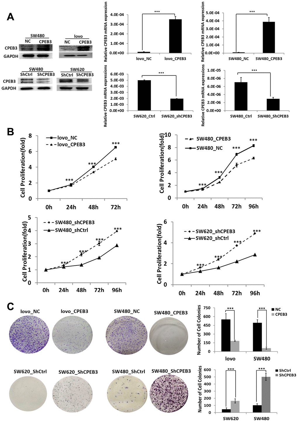 Figure 2. CPEB3 inhibits human colorectal cancer proliferation in vitro. (A) CPEB3 protein expressions of CRC cell lines were efficiently upregulated or downregulated after transfection as analyzed by Western blotting (left) and qPCR (right) detection (**P < 0.01, ***P < 0.001). (B, C) After effective up- or down-regulation of CPEB3, CCK-8 (B) and colony formation (C) assays were performed to explore the effect of CPEB3 on proliferative capacity of colorectal cancer cell line.