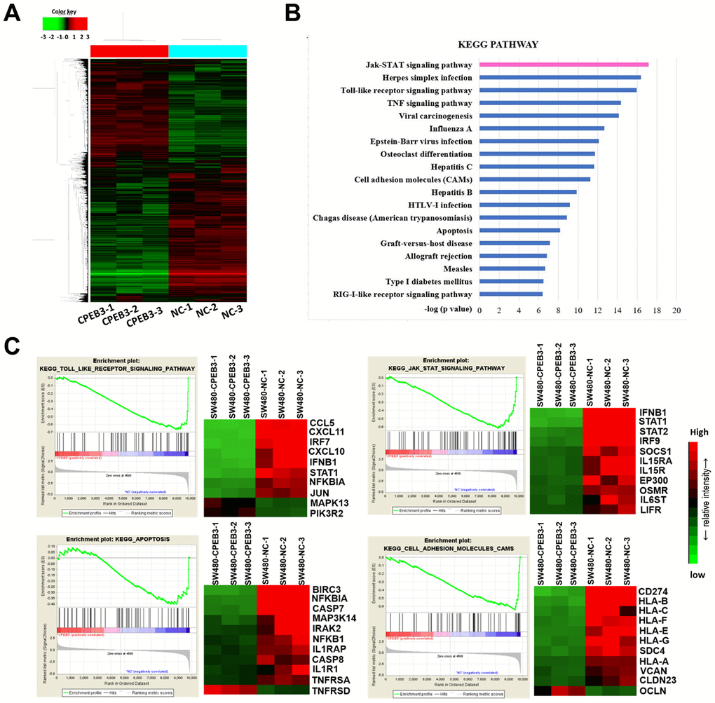 Figure 3. Overexpression of CPEB3 inhibits a cluster of signaling pathways associated with tumor progression in colorectal cancer cells. (A) Microarray analysis was applied to screen the mRNAs which can be regulated by CPEB3. (B) Canonical pathway enrichment of whole genome expression in SW480-CPEB3 and SW480-NC cell lines was analyzed based on KEGG pathway database. (C) Gene set enrichment analysis results for all fold changes calculated between SW480-CPEB3 and SW480-NC cells were shown on the left and the heatmap analysis of genes in each signaling pathway were displayed on the right. Red represents high expression levels and green represents low expression levels.
