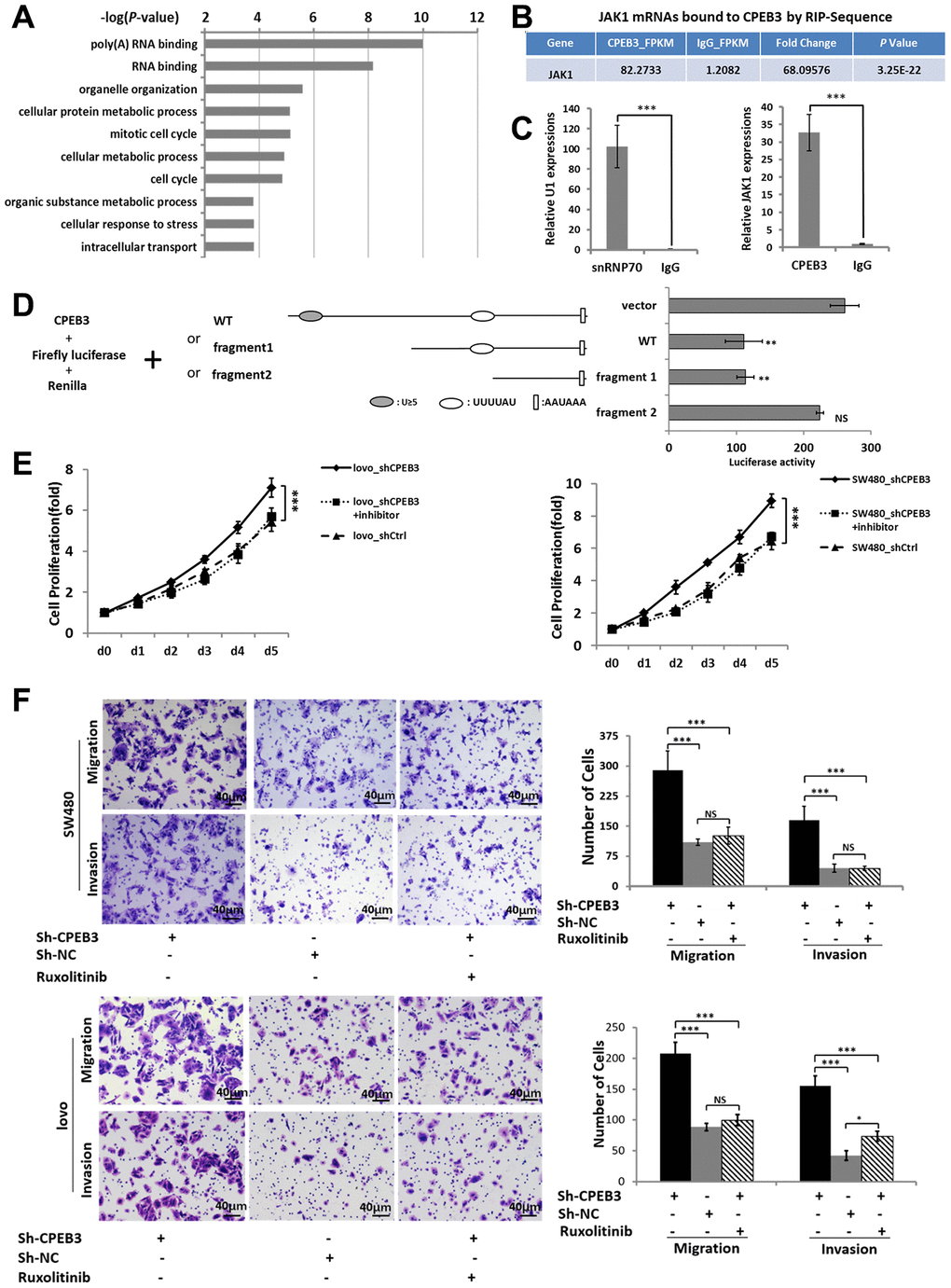 Figure 4. CPEB3 directly targets the 3’UTR of JAK1 and regulates colorectal cancer proliferation and metastasis via CPEB3/JAK/STAT axis. (A) High-throughput sequencing analysis of mRNAs bound to CPEB3 in SW480 cells showed the top 10 significantly enriched terms using Gene ontology analysis. (B) RNA immunoprecipitation and high-throughput sequencing analysis showed that JAK1 mRNA was significantly enriched in CPEB3 immunoprecipitates. (C) The combination of JAK1 mRNA and CPEB3 was further validated by RIP-qPCR. IgG and SnRNP70 are used as the negative and positive control respectively. Data are shown as mean ± SD (***P< 0.001). (D) Luciferase reporter plasmid appended with different 3’UTR fragments of JAK1 mRNA were co-transfected with CPEB3 in the HEK-293T cell line, and luciferase activity was detected. Data are displayed as the means ± SD (**P< 0.01, NS: No Significance). (E, F) Impairment of JAK/STAT pathway by Ruxolitinib could reverse the effect of CPEB3 down-regulation on proliferation ability by CCK-8 assay (E) as well as the migration and invasion ability by transwell assays (original magnification, ×400) of colorectal cancer cell lines. (F).